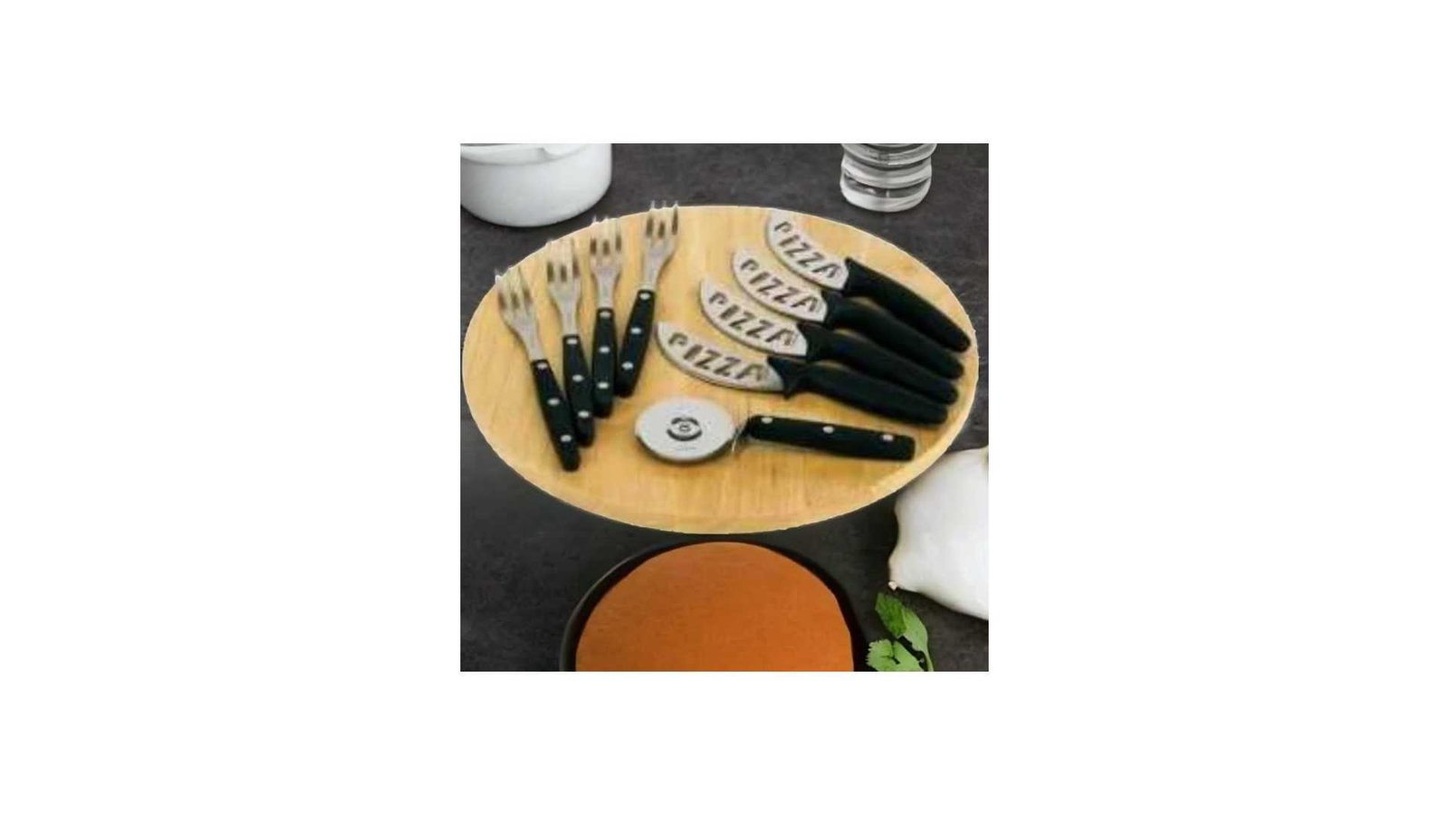 Setul pentru pizza este un set complet ce contine un tocator din lemn , 4 furculite, 4 cutite si un cutter pentru pizza ce va va ajuta sa serviti pizza si pastele ca un bucatar profesionist. Tocatorul are dia.O32 cm.