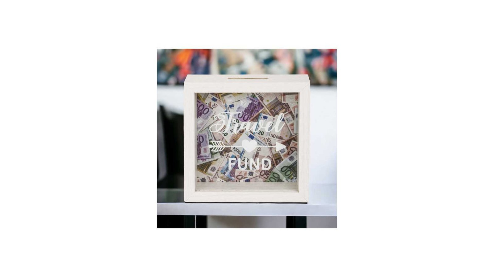 Pusculita Travel Fund este un cadou unic și semnificativ sau o modalitate excelentă de a colecta și a economisi bani pentru orice visezi. Fabricată din lemn și sticlă Dimensiuni aprox.: 15 cm 15 cm