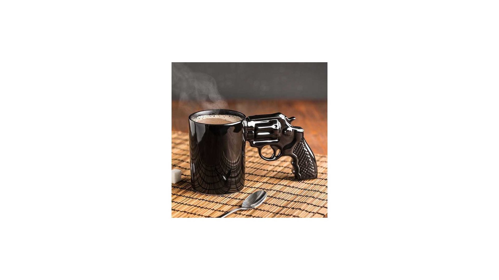 Cana Revolver arata periculos, dar nu trebuie sa iti fie frica de ea. Singurul lucru care iti poate dauna este cafeaua prea tare pe care o vei bea. Cana din portelan are un maner in forma de pistol,cu care orice barbat se va simti in siguranta.In siguranta...