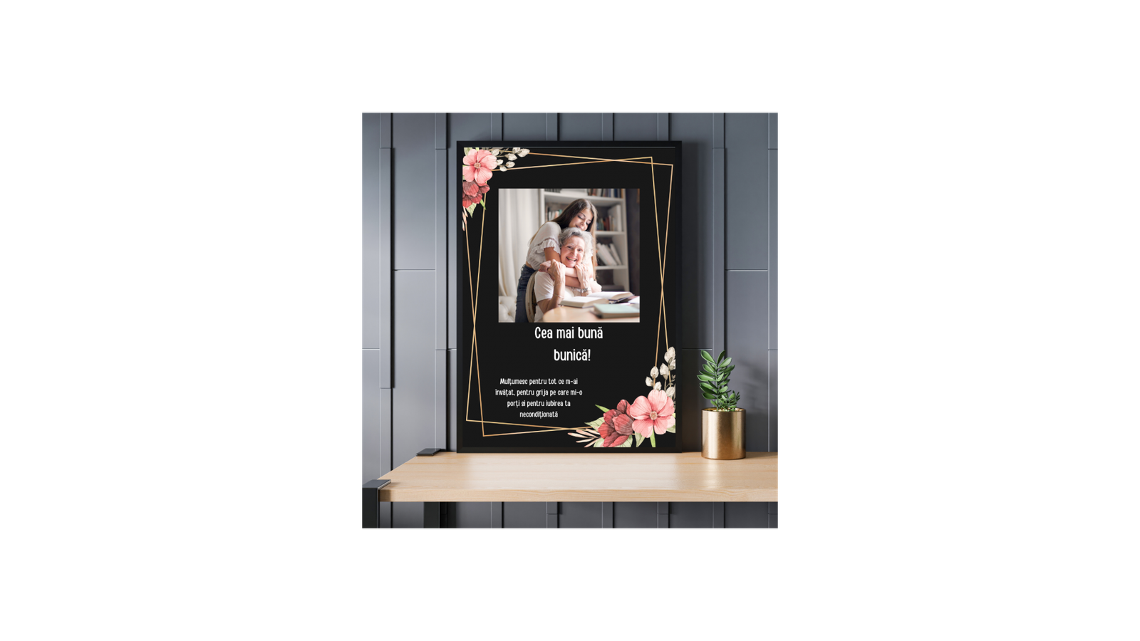 Deoarece bunica ta este cea mai buna povestitoare din lume, poti sa creezi propria ei poveste cu ajutorul acestei rame foto personalizate si cea mai frumoasa poza cu nepotii care are un mesaj plin de recunostinta: Multumim pentru iubirea pe care...