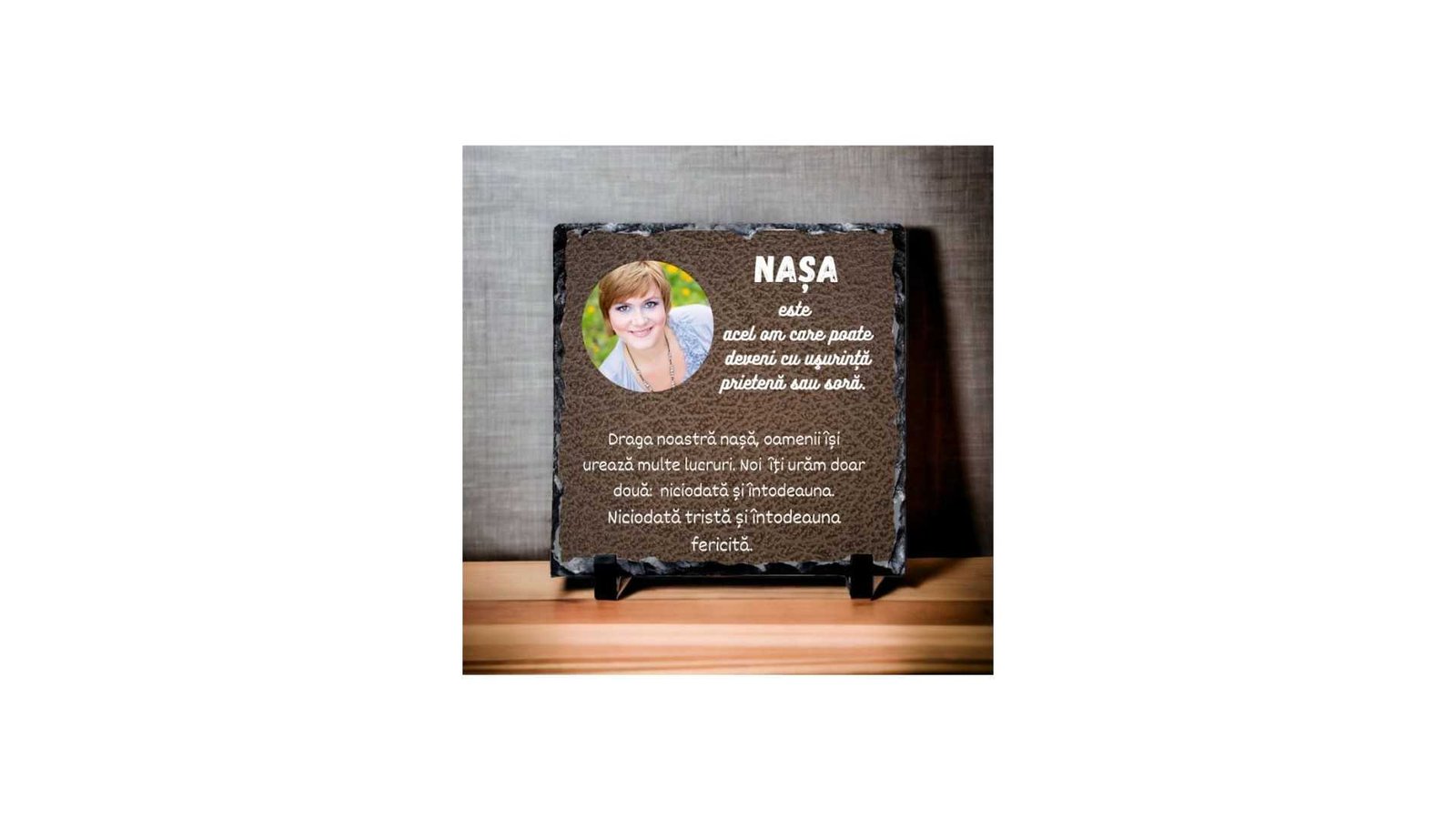 Rama Foto Personalizata Ardezie masoara aproximativ 13cm x 13cm. Marginea va incadra in mod natural fotografiile si poate reprezenta cadou ideal pentru ziua onomastica, zi de nastere sau orice alt eveniment important.