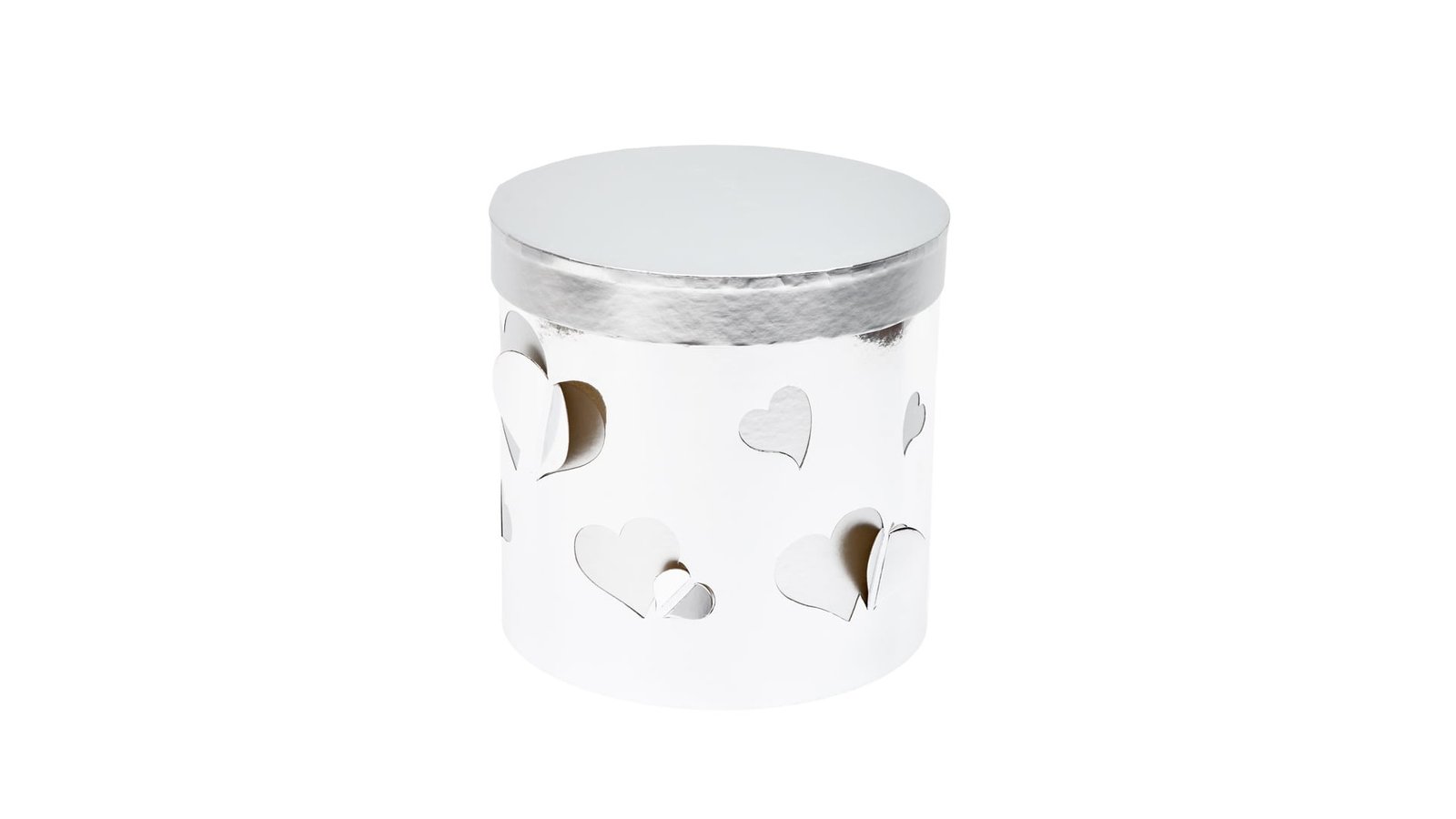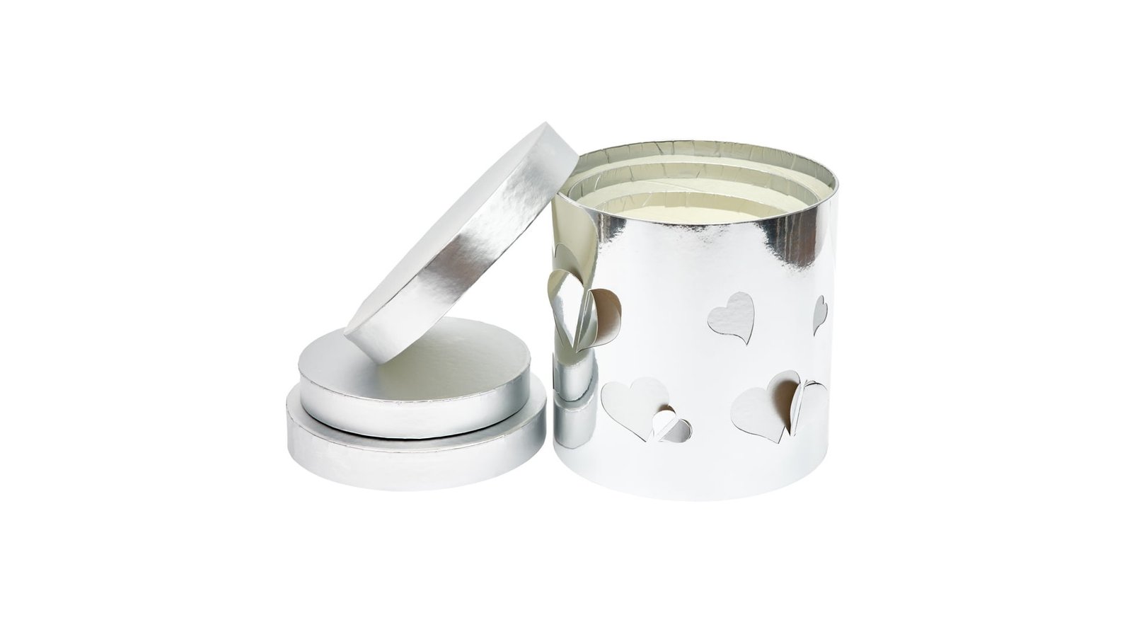 Set 3 cutii rotunde lucioase cu inimi - argintiu se pot folosi pentru ambalaje de flori, buchete, trandafiri, cadouri, mărturii, produse handmade, decorațiuni și multe altele perfecte pentru evenimente cum ar fi: nunți, botezuri, Crăciun, Paște, Valentine's Day, mărțișor, 8 martie, petreceri pentru copii, zile de naștere, etc. set 3 cutii de dimensiuni diferite