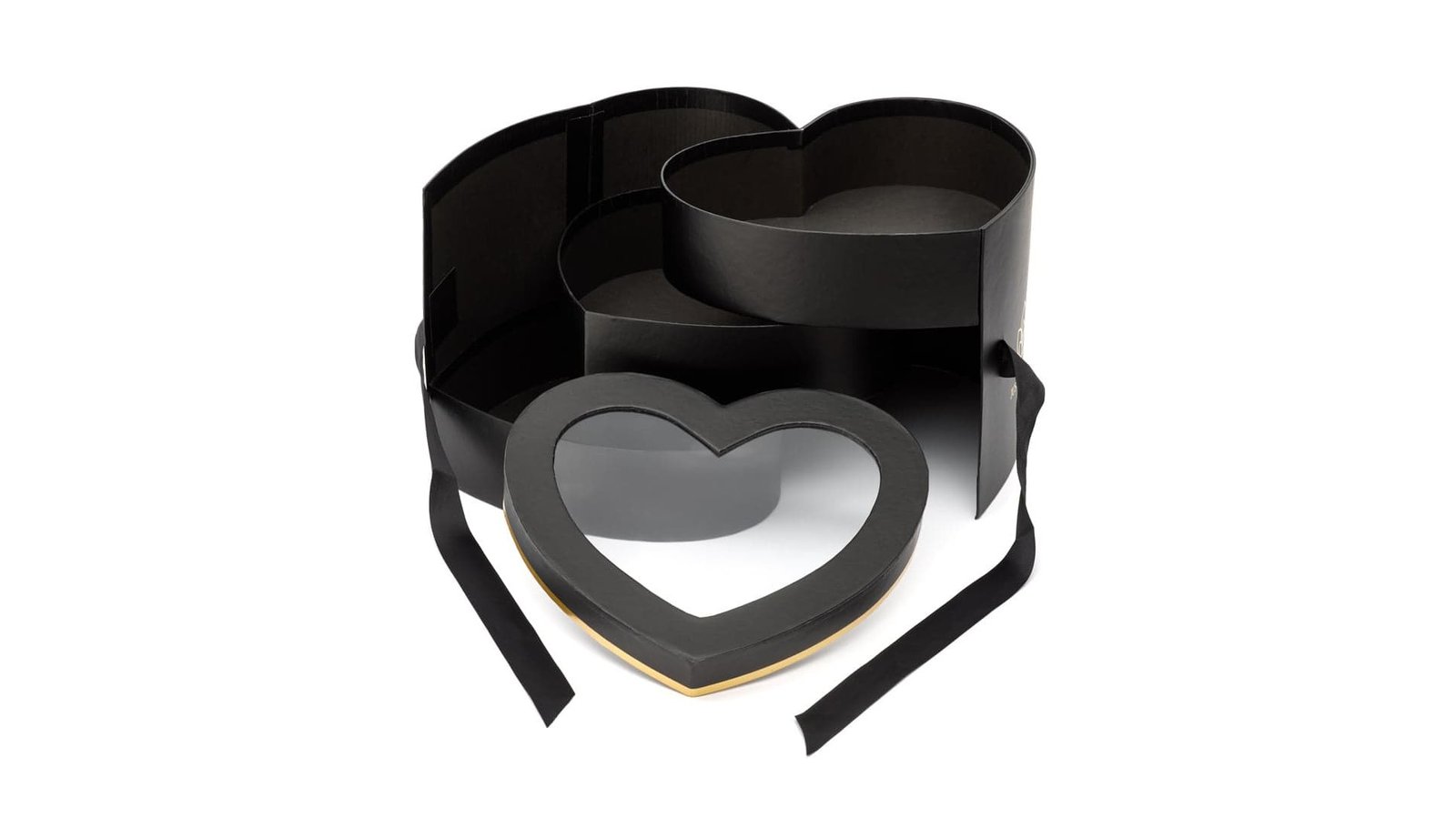 Cutie inimă cu fereastră fundă și sertar - negru se poate folosi pentru ambalaje de flori, buchete, cadouri, mărturii, produse handmade, decorațiuni și multe altele perfectă pentru evenimente cum ar fi: nunți, botezuri, Crăciun, Paște, Valentine's Day, mărțișor, 8 martie, petreceri pentru copii, zile de naștere, etc. fundă satinată