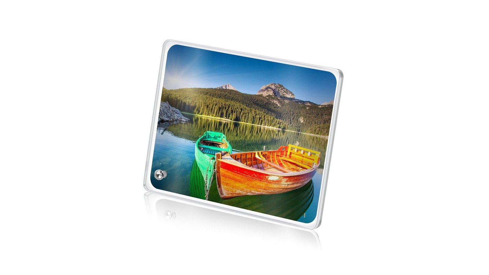 Tablou sticlă sublimare 23x18 cm Dimensiune de printare este de 22.1 X 17.1 cm Placă groasă de sticlă tratată special pentru a fi imprimată prin sublimare Sublimarea se face pe partea din spate a plăcii și nu se imprimă in oglinda Se poate imprima la presă plană sau la presă vacuum Este ambalat în folie cu bule și cutie de carton albă lucioasă Conține suport pentru birou