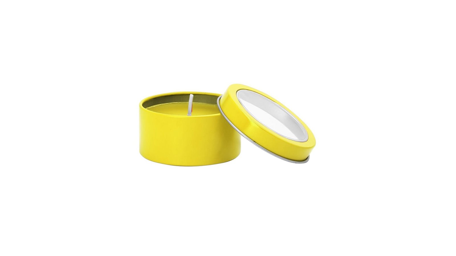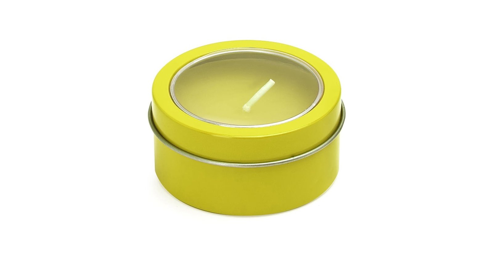 Lumânare parfumată cu capac - galben Capac transparent cu fereastră, iar recipientul rotund este din metal Culoarea recipientului este aceeași cu ceara Ambalate în pungă de plastic
