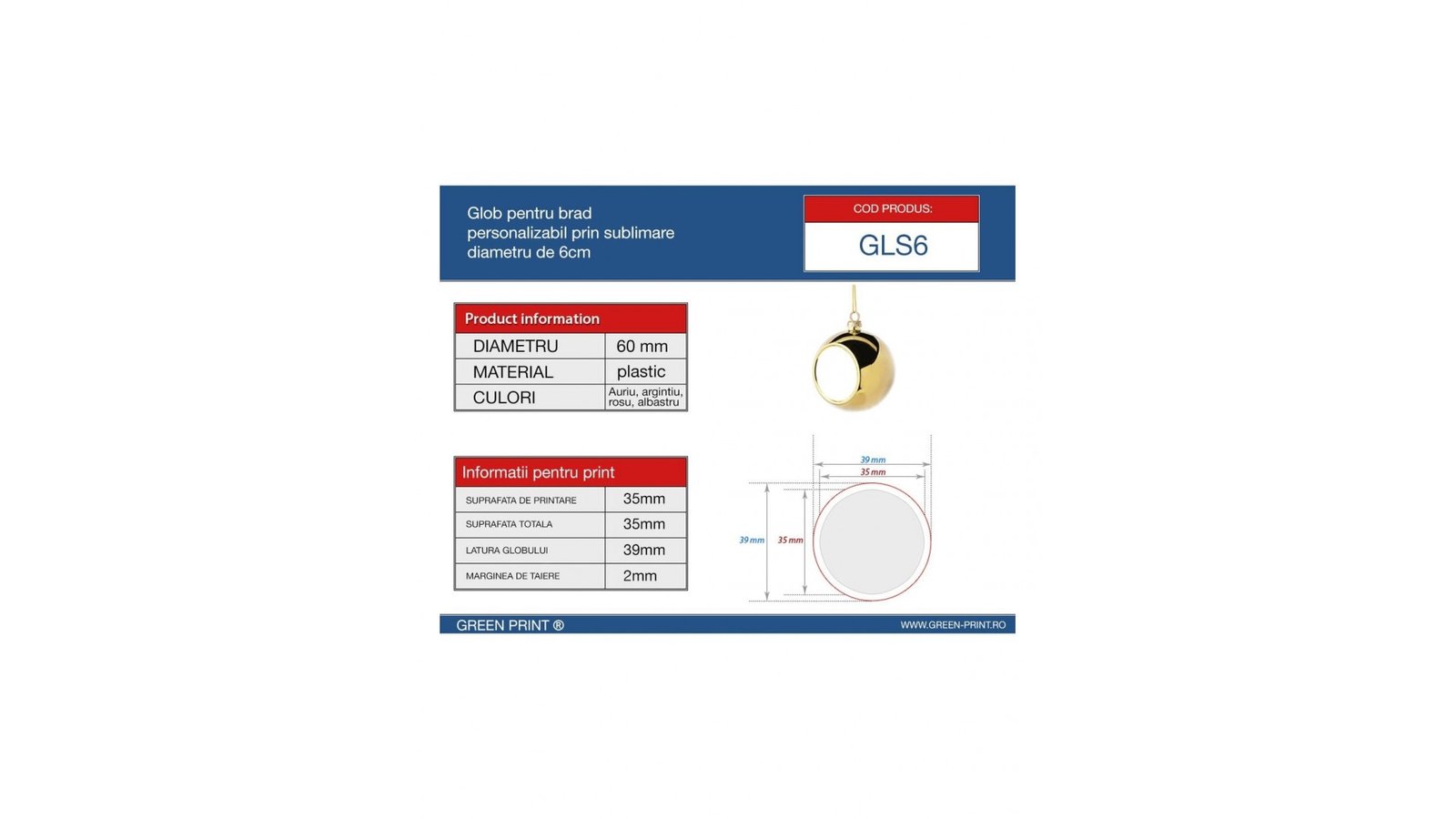 Glob sublimabil pentru brad 6cm Globul se poate personaliza și fără sublimare, în loc de plăcuța de sublimare se poate lipi o fotografie pe hârtie pe partea adezivă a globului Prin sublimare se personalizează partea metalică și apoi se lipește pe partea plată a globului. Globurile sunt prevăzute cu un strat autoadeziv pe care se lipește partea metalică Atenție! Îndepărtați folia de protecție de pe partea metalică Se pot imprima la prese plane sau vacuum, dimensiune de printare este de 3,5 cm Ideale pentru a crea cadouri unice