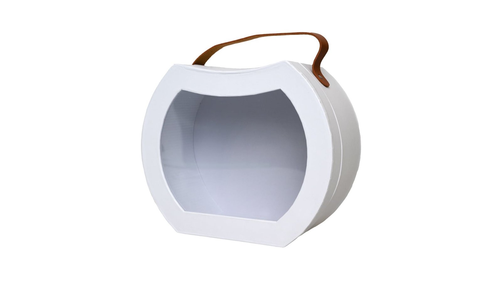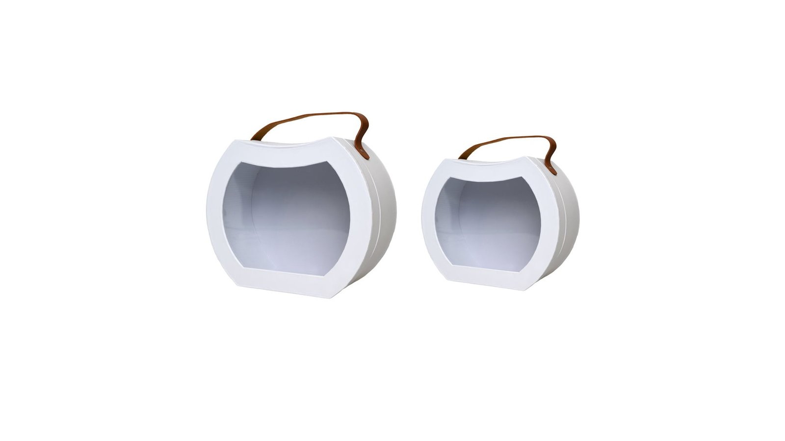 Set 2 cutii rotunjite cu mâner maro și fereastră - alb se poate folosi pentru ambalaje de flori, buchete, cadouri, mărturii, produse handmade, decorațiuni și multe altele perfectă pentru evenimente cum ar fi: nunți, botezuri, Crăciun, Paște, Valentine's Day, mărțișor, 8 martie, petreceri pentru copii, zile de naștere, etc. mâner din piele întoarsă