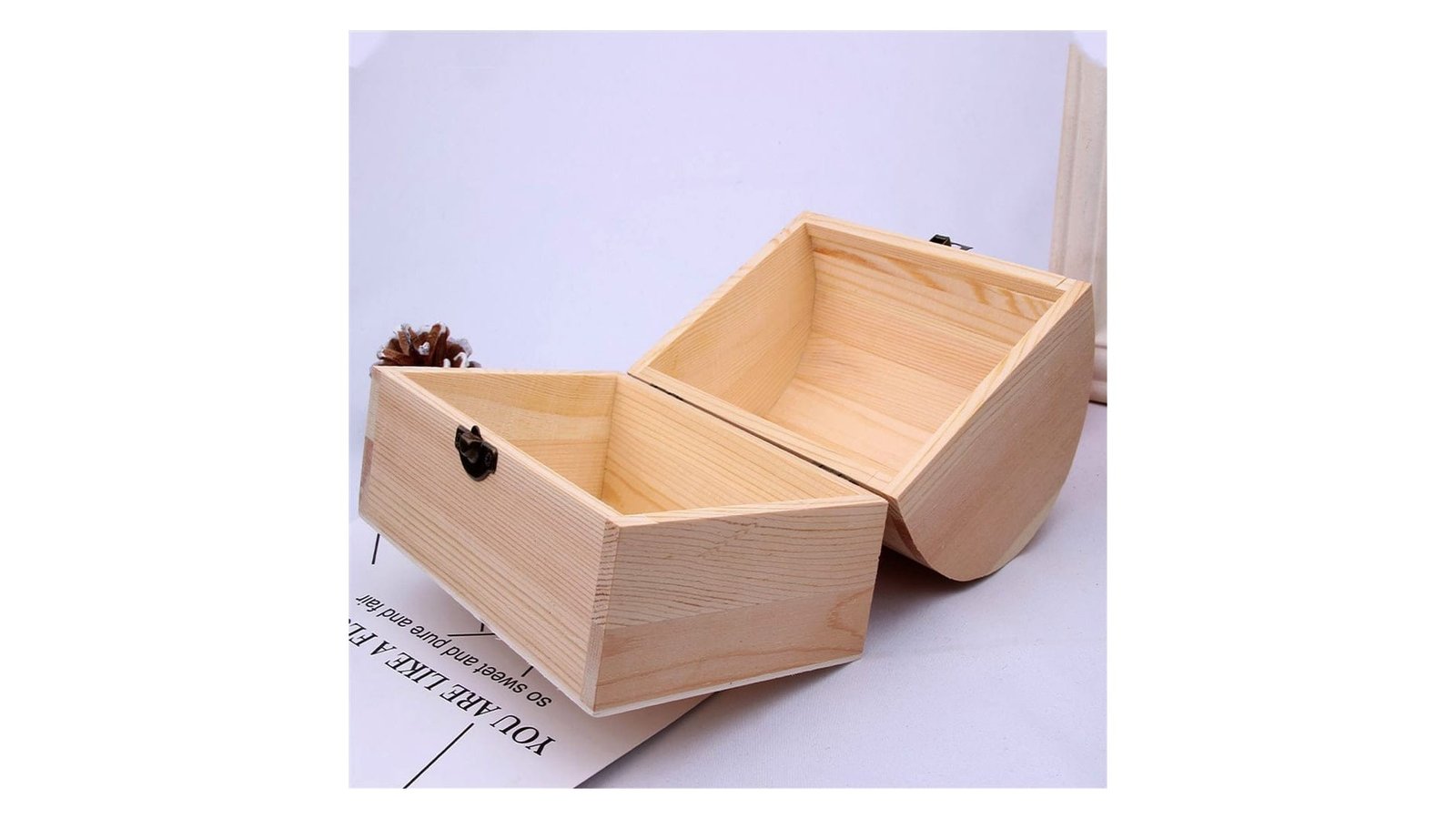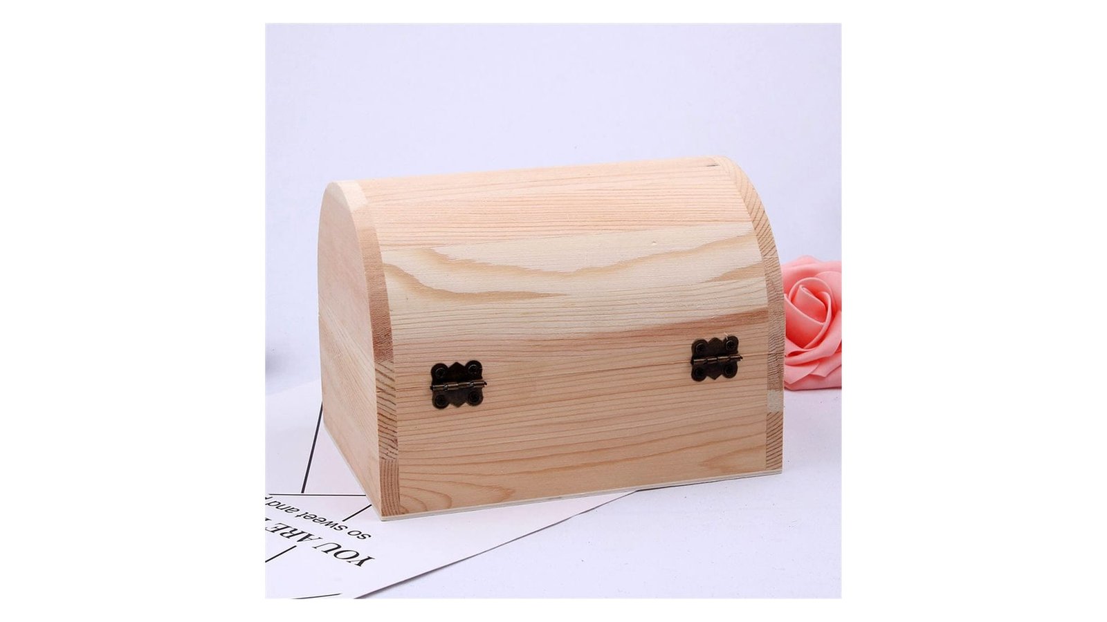 Cutie cufăr din lemn medie 12x8x9cm cutie din lemn de pin folosită în proiectele DIY ideală pentru personalizat prin tehnica șervețelului, decoupage, pictat, pirogravură și altele ambalată în pungă de plastic balamalele și închizătoarea sunt din metal poate fi folosită și ca o cutie de bijuterii material nefinisat ce permite lăcuire/vopsire/pictare/printare
