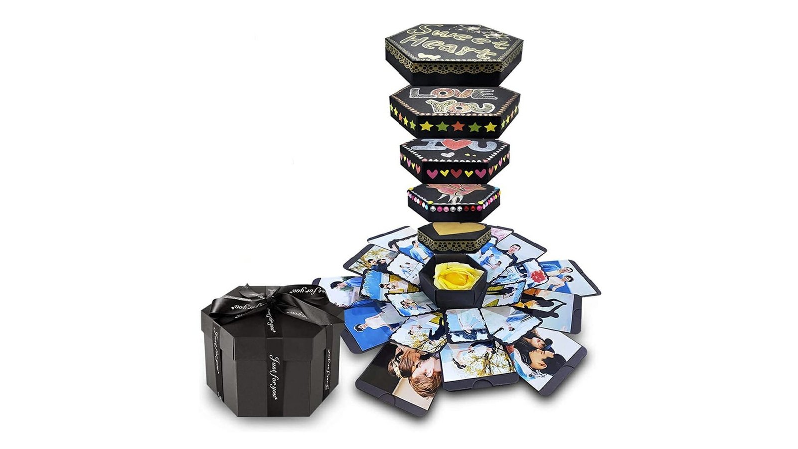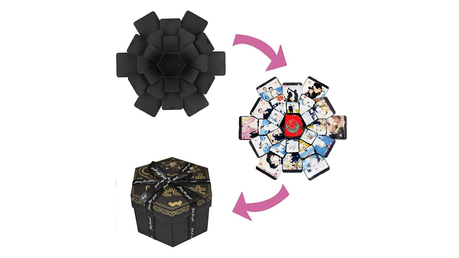 Cutie foto explozivă hexagonală (Explosion Box) - negru Cutie FOTO ce "explodează" cu o mulțime de poze când este scos capacul Fabricat din carton, produsul este livrat dezasamblat și necesită aproximativ 10 minute pentru a fi asamblat în formă finală Pozele și accesoriile cu care doriți să personalizați această cutie se pot aplica cu un lipici comun de hartie sau cu bandă dublu adezivă (produsul nu contine alte accesorii) Poate îmbina până la 24 de poze Pozele nu sunt incluse Dimensiuni poze: 5x7cm, 6,5x8,5cm, 8x10cm, 9x12cm În mijlocul cutiei se așează o cutie mică în care poate fi introdus un cadou Pentru ansamblarea cutiei puteți urmări link-ul următor: https://www.youtube.com/watch?v=MVhW00RyYEw&t=2s Pozele nu sunt incluse și nu oferim servicii de personalizare.