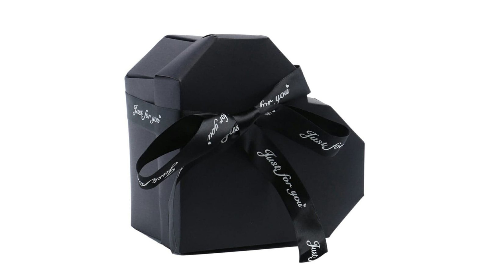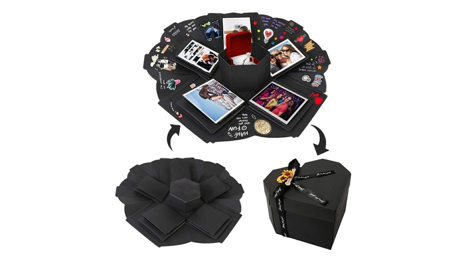 Cutie foto explozivă inimă (Explosion Box) - negru Cutie FOTO ce "explodează" cu o mulțime de poze când este scos capacul Fabricat din carton, produsul este livrat dezasamblat și necesită aproximativ 10 minute pentru a fi asamblat în formă finală Pozele și accesoriile cu care doriți să personalizați această cutie se pot aplica cu un lipici comun de hartie sau cu bandă dublu adezivă (produsul nu contine alte accesorii) Poate îmbina până la 10 de poze Dimensiunile pozelor variază de la 7x10cm până la 10x10,5cm Pozele nu sunt incluse În mijlocul cutiei se așează o cutie mică în care poate fi introdus un cadou Pentru ansamblarea cutiei puteți urmări link-ul următor: https://www.youtube.com/watch?v=8yuDsD9za7M Pozele nu sunt incluse și nu oferim servicii de personalizare.