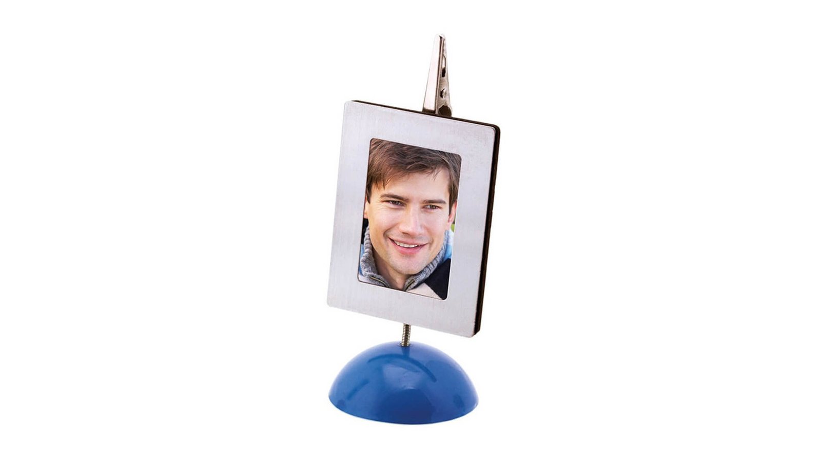 Suport foto cu clemă pentru notițe - albastru Dimensiune poză/document 3,5 x 5 cm Diametru bază 4,8 cm Mini ramă foto cu suport de birou și suport de notițe Fabricată din metal și plastic Ambalat în cutie transparentă de PVC Baza este fabricată din plastic Rama se poate detașa de pe corpul suportului, aceasta fiind magnetică. Pozele nu sunt incluse și nu oferim servicii de personalizare.