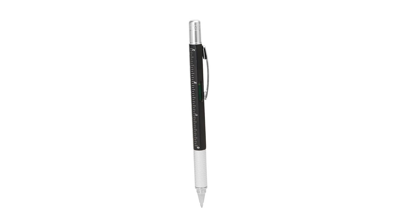 Pix multifuncțional 5în1 - negru Pix multifuncțional cu 5 funcții: Pix cu mină albastră Șurubelniță cap + Șurubelniță cap - Măsurarea nivelului (boloboc) Riglă în cm și inch Mecanism rotativ Pentru a folosi șurubelnița se desface capacul din spate și se înfiletează peste capătul pix Poate fi imprimat prin tampografie sau print UV Ambalat în pungă de plastic