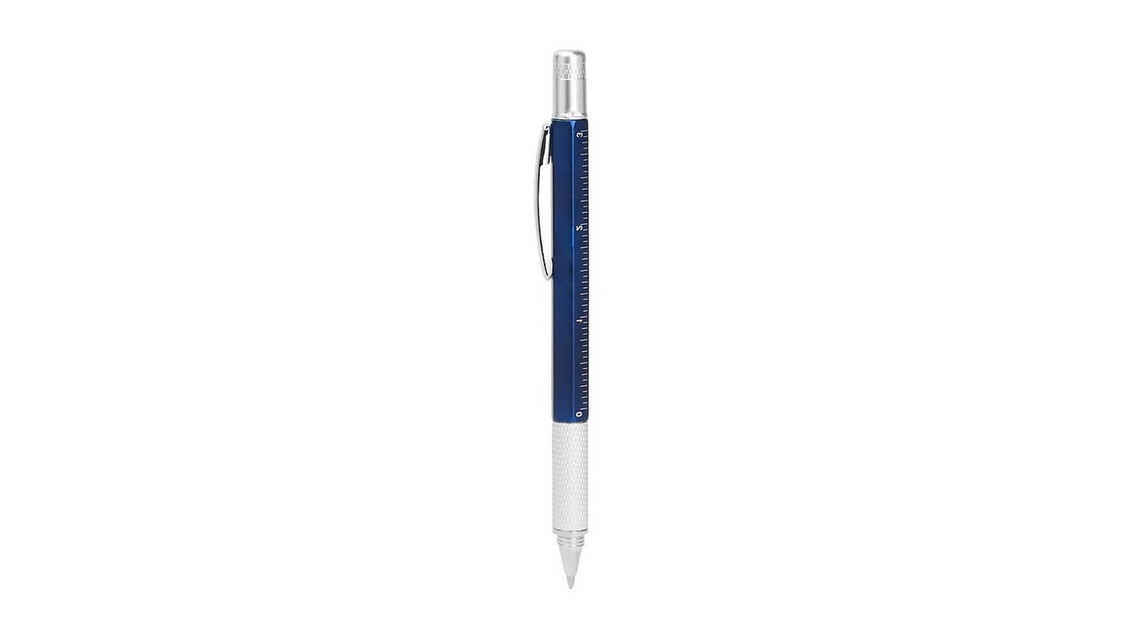 Pix multifuncțional 5în1 - albastru Pix multifuncțional cu 5 funcții: Pix cu mină albastră Șurubelniță cap + Șurubelniță cap - Măsurarea nivelului (boloboc) Riglă în cm și inch Mecanism rotativ Pentru a folosi șurubelnița se desface capacul din spate și se înfiletează peste capătul pix Poate fi imprimat prin tampografie sau print UV Ambalat în pungă de plastic
