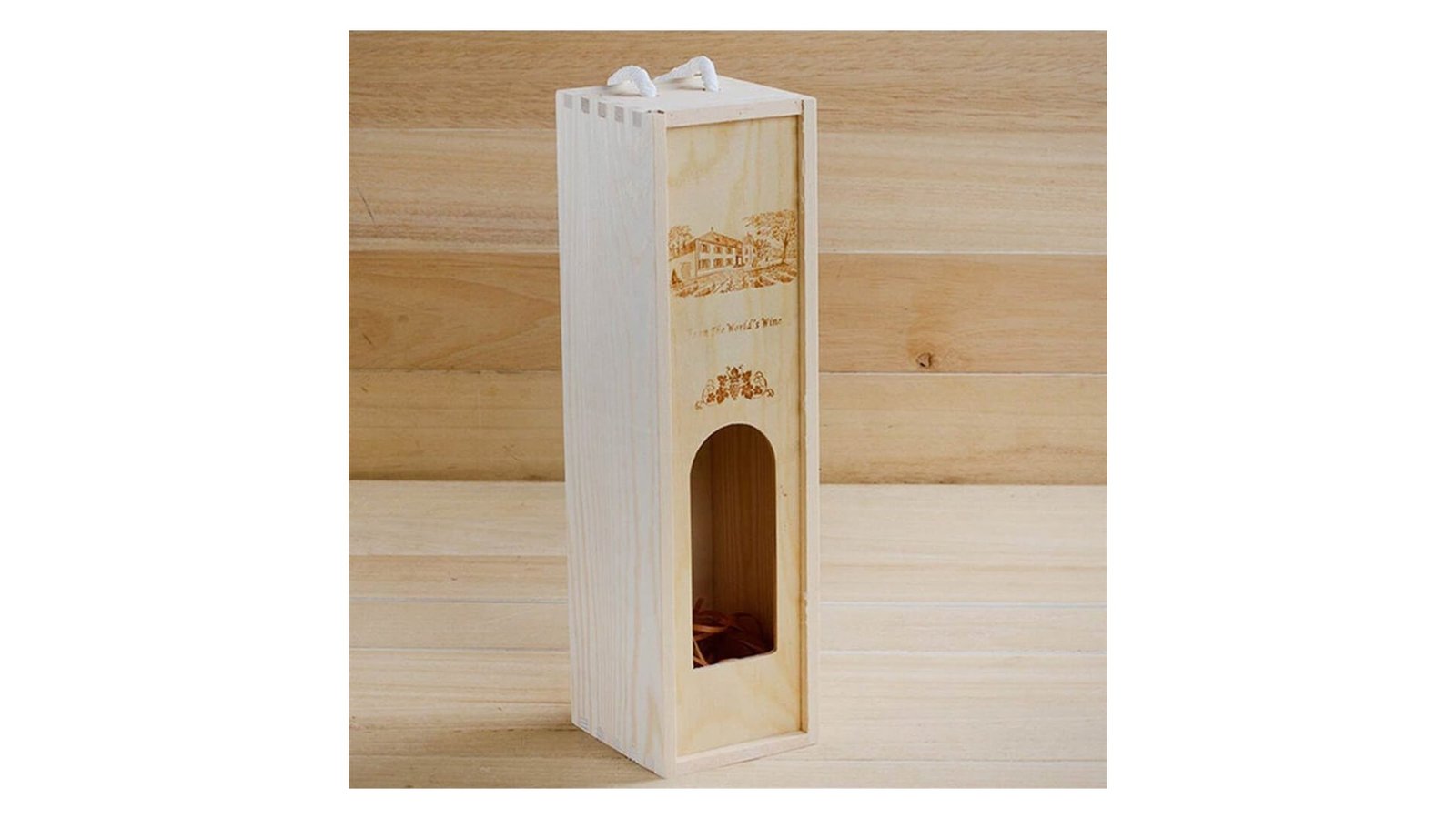 Cutie din lemn pentru sticlă de vin cu fereastră și mâner cutie din lemn de pin, cu capac glisant și mâner din sfoară ideală pentru personalizat prin pictat, gravură, pirogravură, print UV material nefinisat ce permite lăcuire/vopsire/pictare/printare conține lână de hârtie pentru a decora sticla din interior destinată sticlei clasice de vin de 750ml, nu este compatibilă cu sticlele de șampanie sau vin spumant ambalată în pungă de plastic