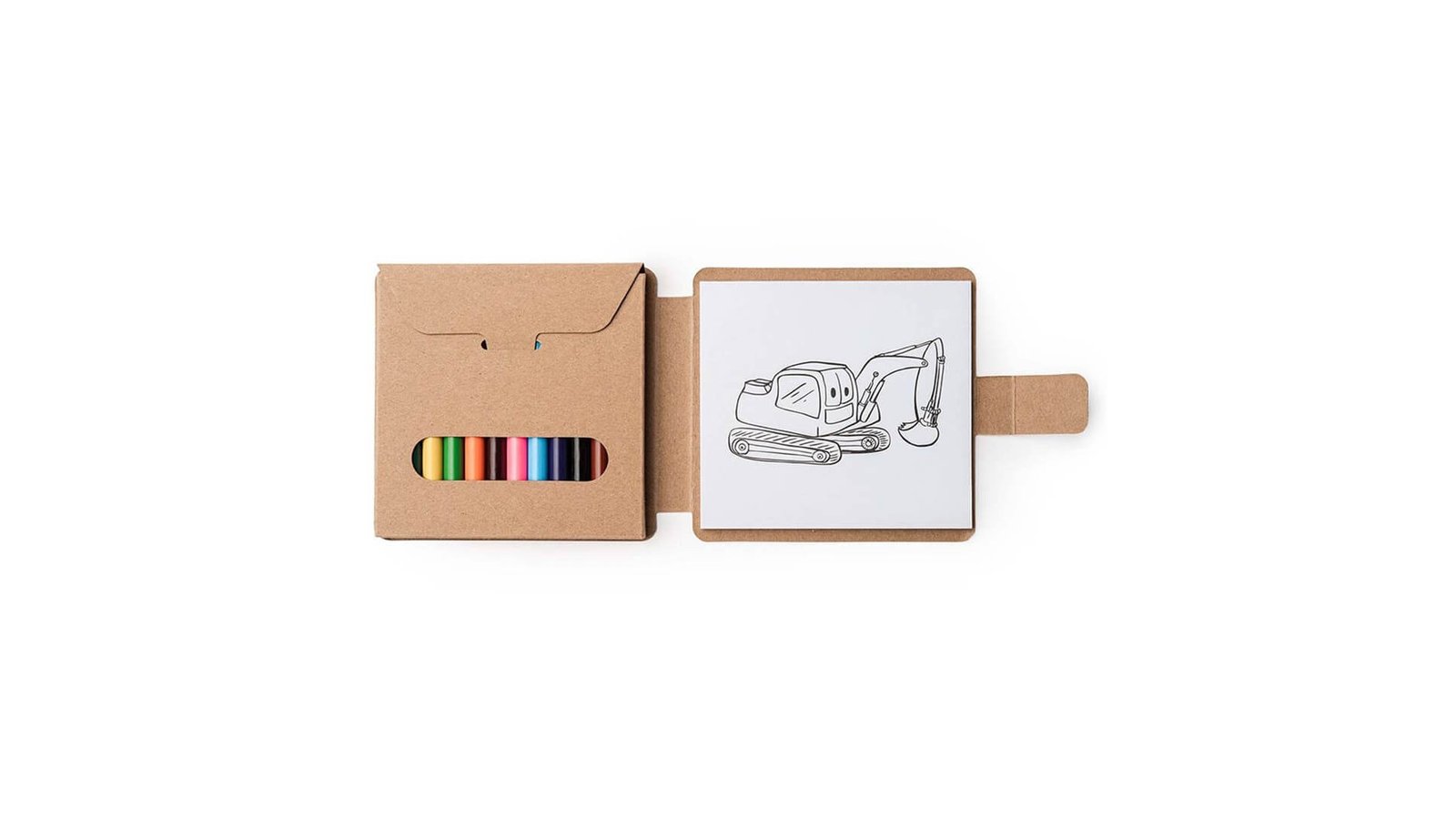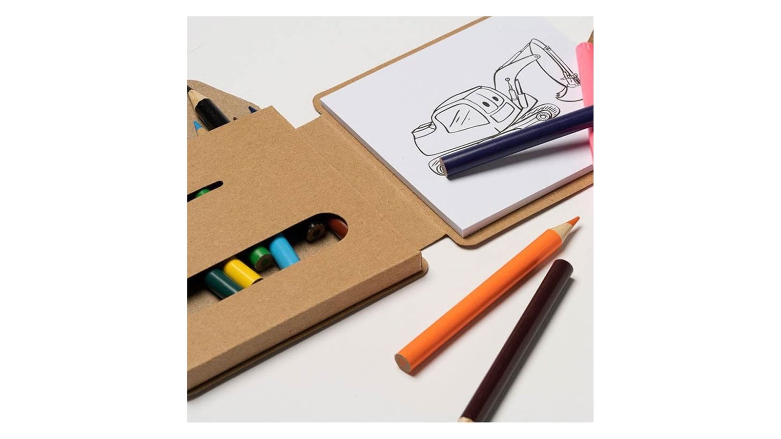 Set de colorat cu desene și creioane set pentru desenat compus din creioane colorate ascuțite și carnețel cu desene cutie fabricată din carton reciclat, conține 12 culori: roșu, galben, albastru, verde închis, verde deschis, negru, portocaliu, roz, albastru royal, maro, mov, vișiniu conține 35 de coli cu 12 desene diferite compatibil cu imprimarea prin serigrafie sau se pot personaliza cu ștampila ambalat în pungă de plastic