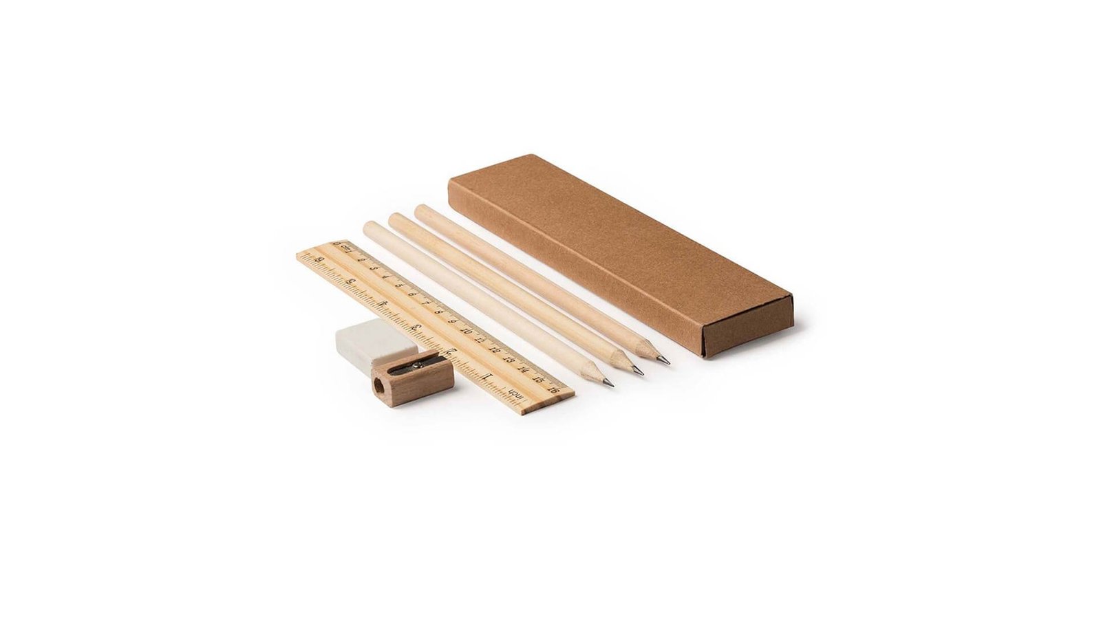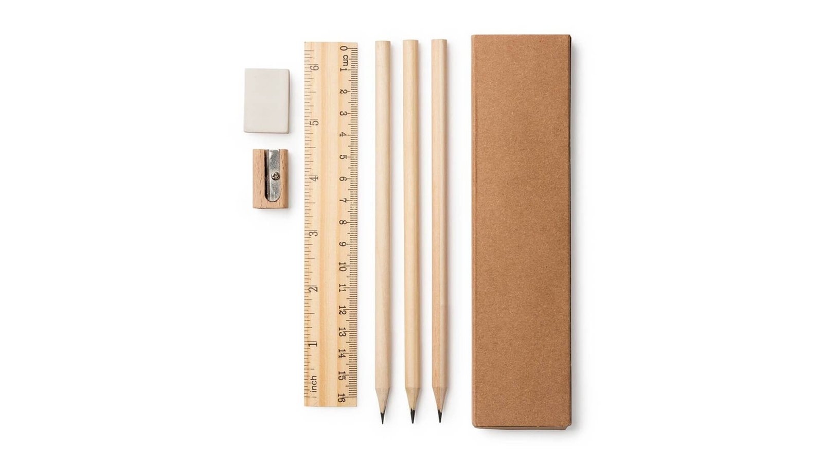 Set promoțional de creioane set ce conține 3 creioane, riglă, gumă și ascuțitoare fabricate din materiale naturale creioanele sunt deja ascuțite, rigla este cu gradație în cm și inch ambalate în cutie din carton kraft reciclat
