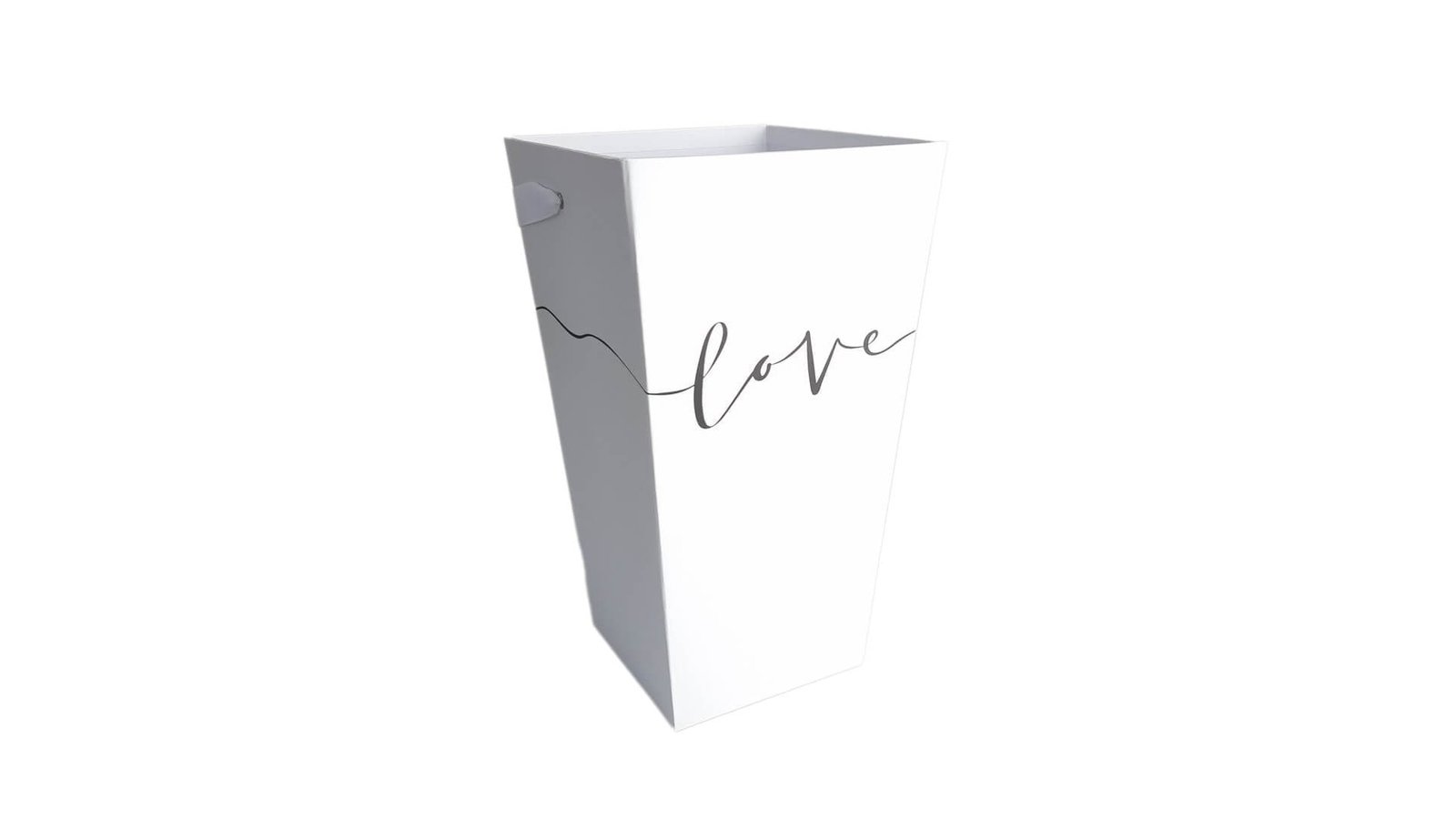 Cutie înaltă cu mâner model Love - alb se poate folosi pentru ambalaje de flori, buchete, cadouri, produse handmade, decorațiuni și multe altele perfectă pentru evenimente cum ar fi: Crăciun, Moș Nicolae, Valentine’s Day, mărțișor, zile de naștere, etc. mâner textil