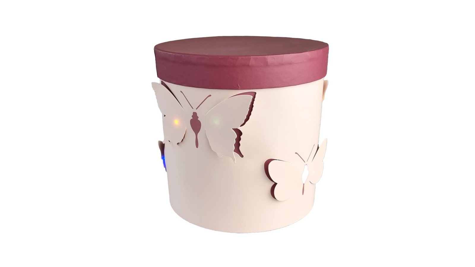 Set 2 cutii rotunde cu fluturi și lumini - roz se pot folosi pentru ambalaje de flori, buchete, trandafiri, cadouri, mărturii, produse handmade, decorațiuni și multe altele perfecte pentru evenimente cum ar fi: nunți, botezuri, Crăciun, Paște, Valentine's Day, mărțișor, 8 martie, petreceri pentru copii, zile de naștere, etc. set 2 cutii de dimensiuni diferite cu luminițe fluturii conțin o bandă led cu lumini colorate și trei trepte de intensitate (aprins complet, pâlpâit lent, pâlpâit rapid)