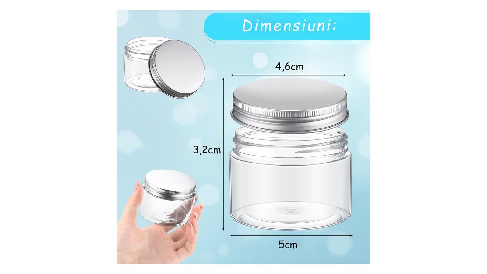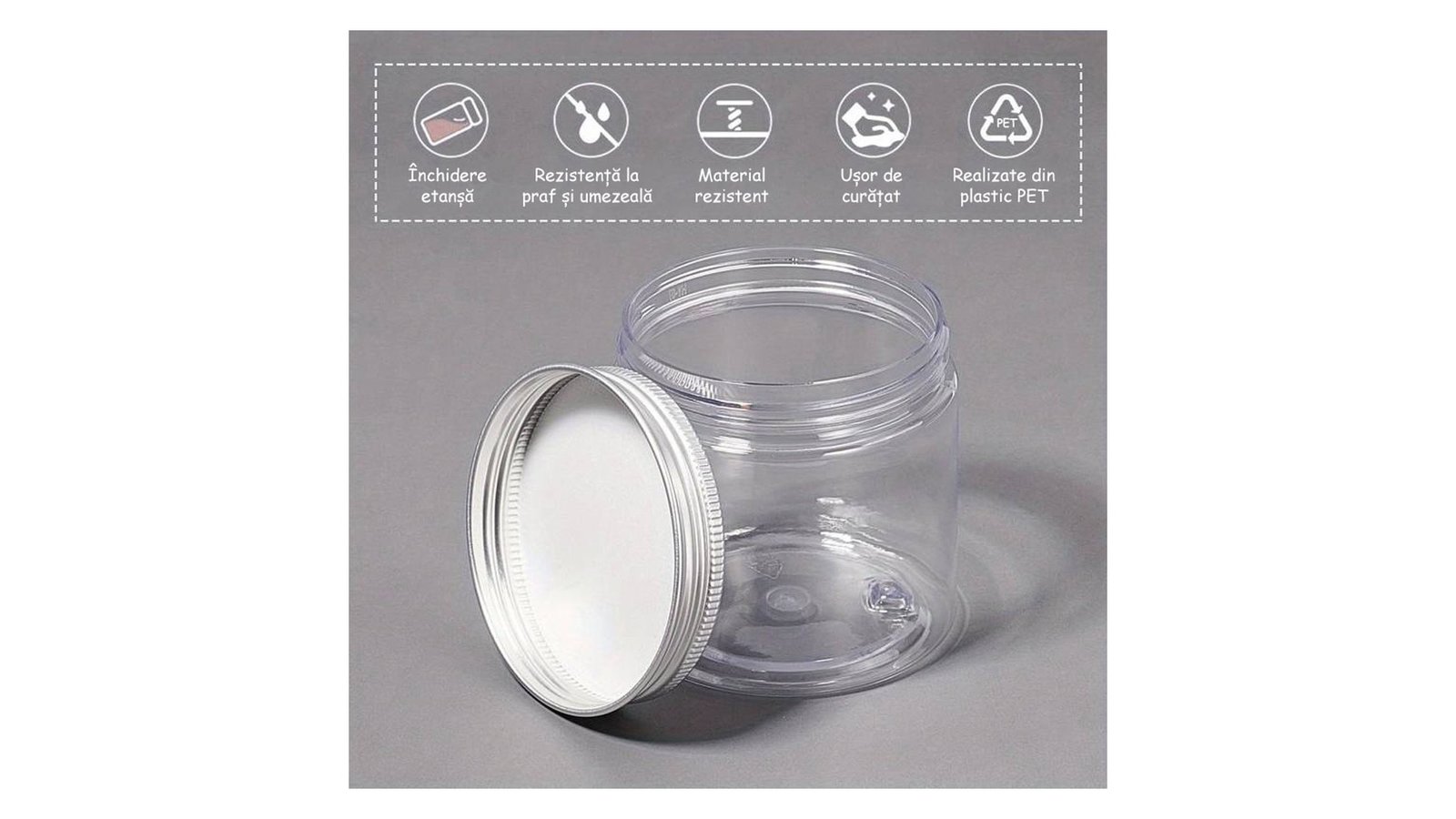 Borcan rotund transparent din plastic cu capac aluminiu, este o modalitate practică și elegantă de a vă organiza și stoca diverse articole. Designul său versatil îl face perfect pentru o varietate de utilizări, de la depozitarea alimentelor la articole de artizanat și produse cosmetice. Caracteristici: Transparent: Permite o vizibilitate clară a conținutului pentru o identificare rapidă și ușoară Rotund: Design compact și eficient pentru optimizarea spațiului de depozitare Plastic: Material ușor și durabil, ideal pentru uz zilnic Capac din aluminiu: Asigură o etanșare sigură pentru a menține prospețimea conținutului și a preveni scurgerile Folie de protecție din hârtie cu adeziv pentru sigilare Utilizări: Depozitarea alimentelor: Perfect pentru condimente, ierburi uscate, dulciuri, cereale și alte produse alimentare uscate Articole de artizanat și rechizite: Ideal pentru stocarea de mărgele, paiete, nasturi, șuruburi, cuie și alte obiecte mici Produse cosmetice și de îngrijire: Stochează cu ușurință creme, loțiuni, săpunuri solide, toneruri și alte produse de îngrijire personală Produse DIY: Perfect pentru amestecuri personalizate, slime, lumânări, articole de pescuit, momeli și alte proiecte creative Beneficii: Versatil: Utilizări multiple pentru o varietate de nevoi Organizat: Mențineți dulapurile și spațiile de lucru ordonate și curate Durabil: Fabricat din plastic rezistent pentru o utilizare îndelungată Reutilizabil: O alternativă ecologică la recipientele de unică folosință