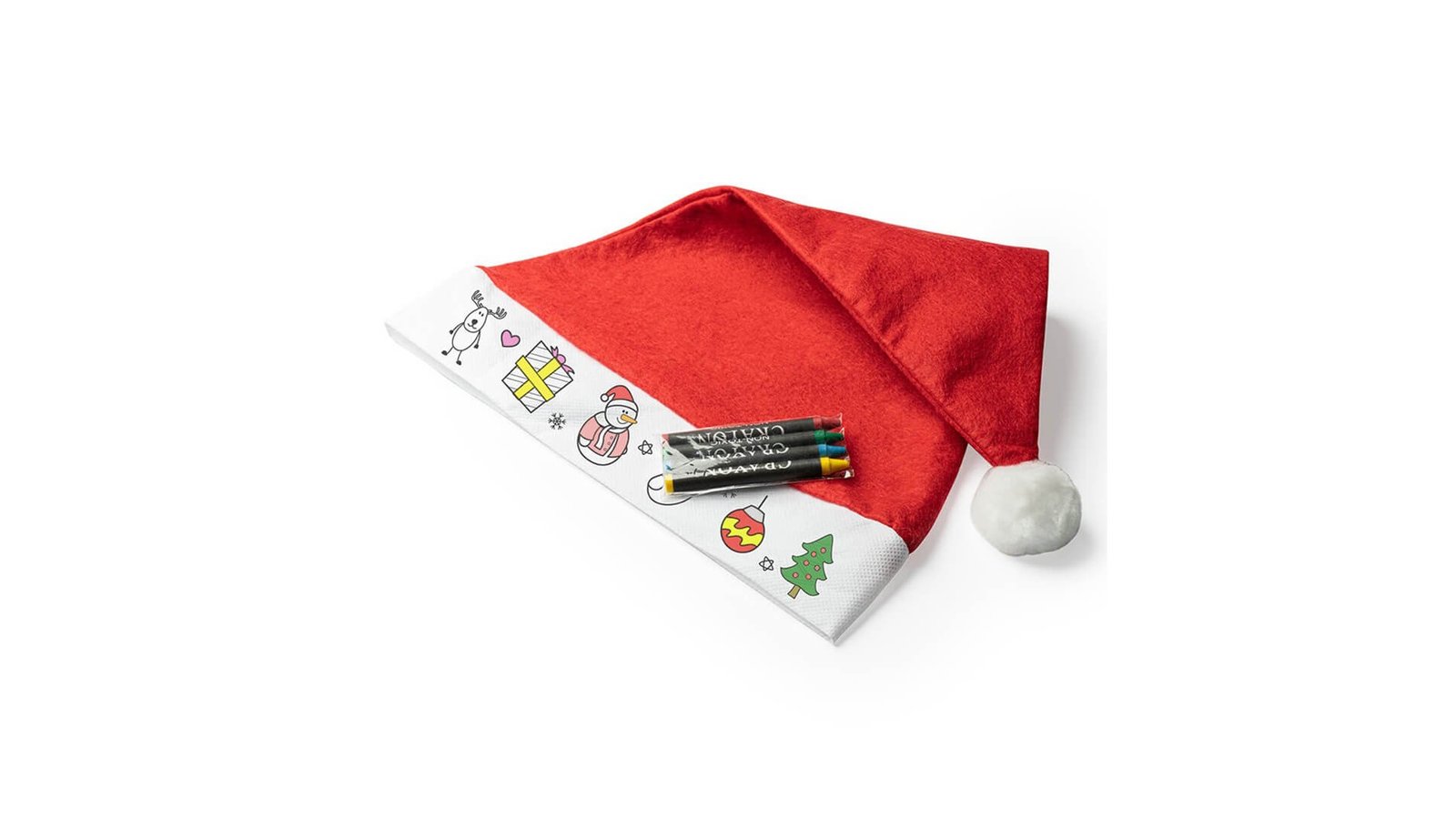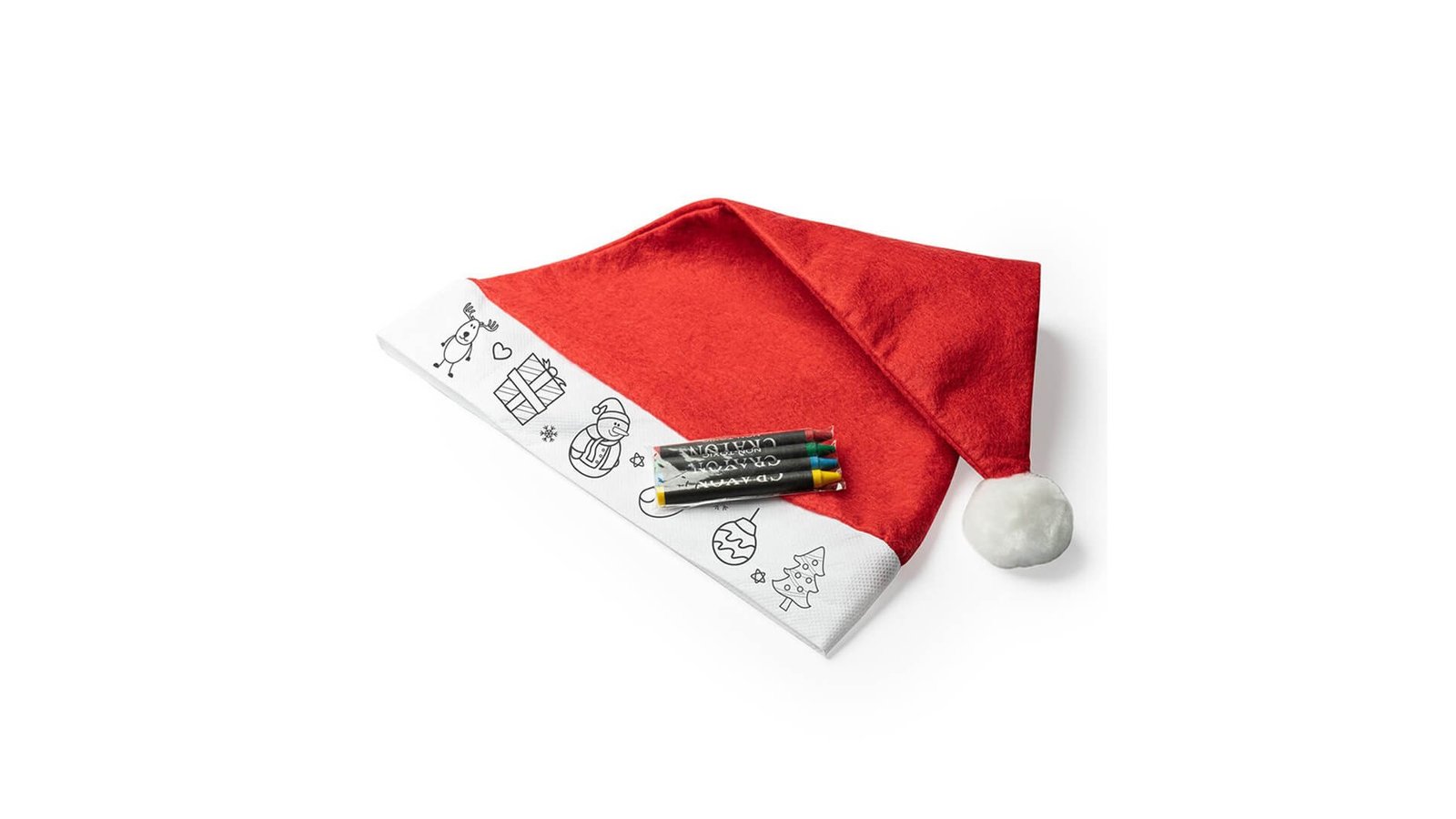 Căciulă Moș Crăciun pentru colorat poate fi colorată cu creioane colorate, acestea sunt incluse în prețul căciulii produs fabricat din material textil nețesut, material pufos, are cusăturile pe interior ambalate în pungă de plastic potrivită pentru perioada sarbatorilor de iarnă, poate fi purtată sau folosită ca decorațiune de Crăciun