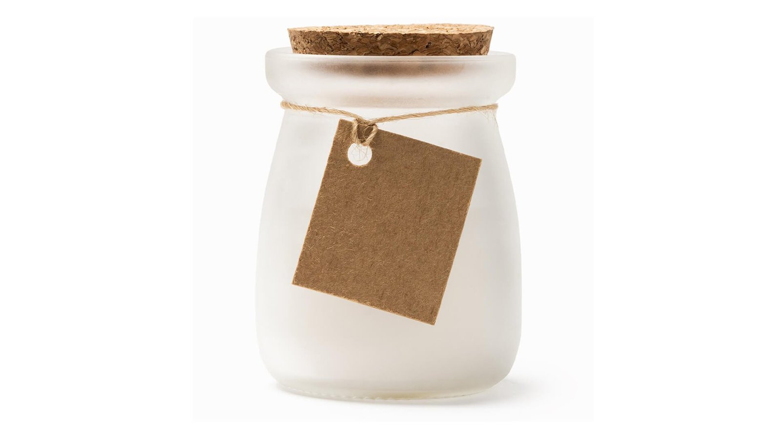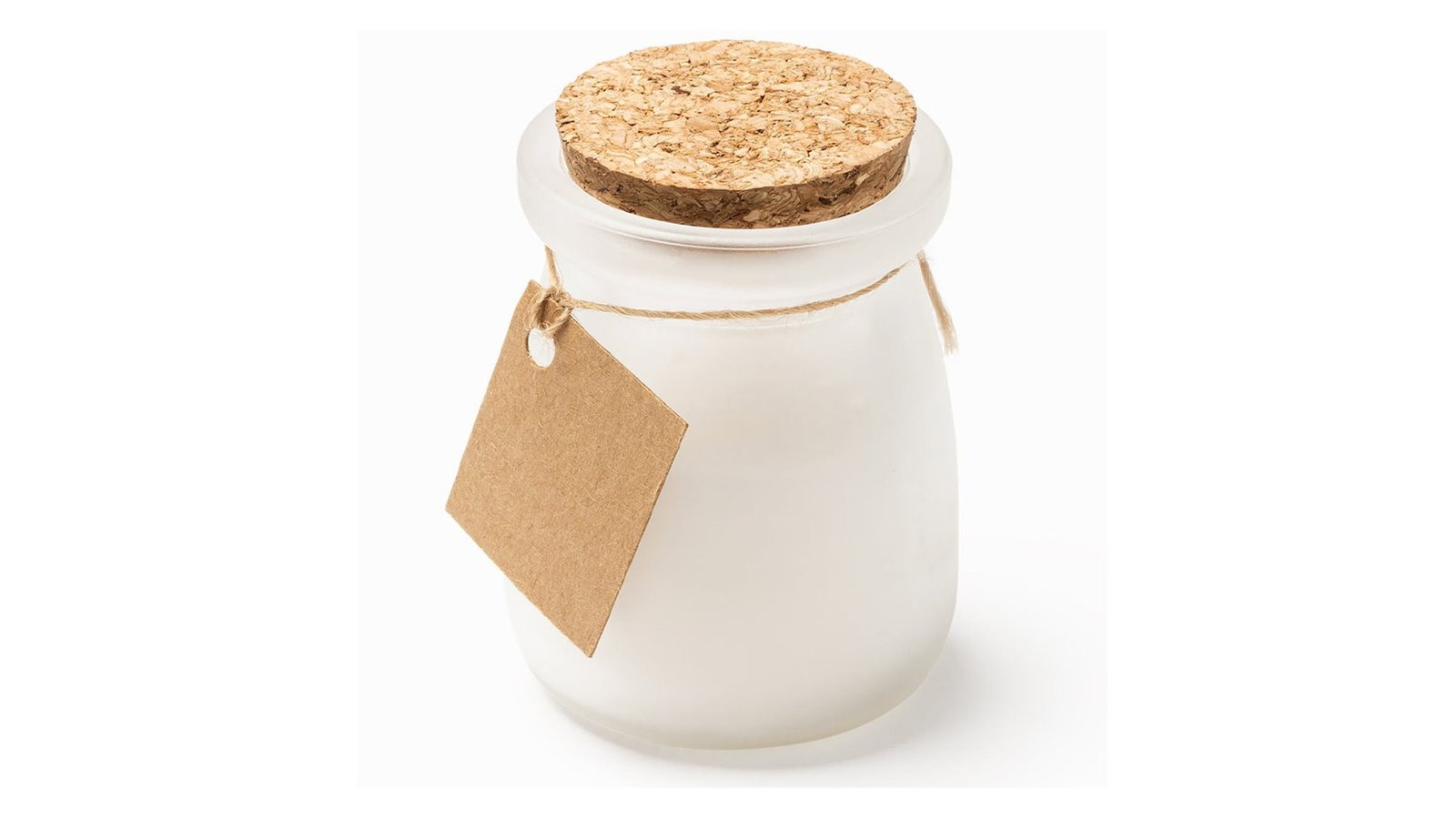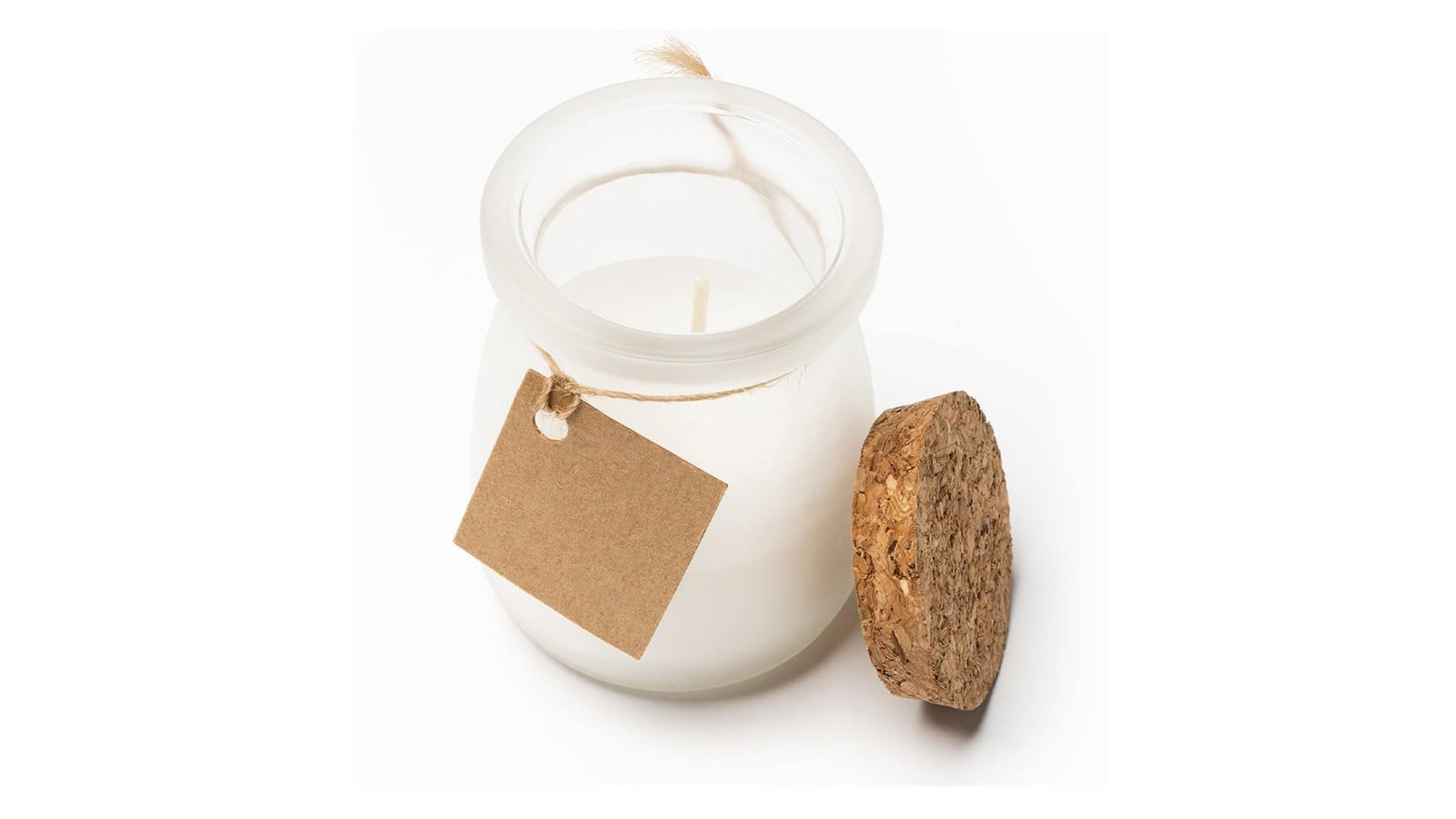 Lumânare parfumată cu capac din plută Recipientul cilindric este din sticlă sablată mată, capacul din plută, ceara este albă Ambalat într-o cutie elegantă de carton reciclat Parfum de vanilie Capacul poate fi gravat laser sau imprimat prin tampografie Dispune de etichetă blank ce poate fi personalizată De asemenea poate fi personalizată și cu stickere