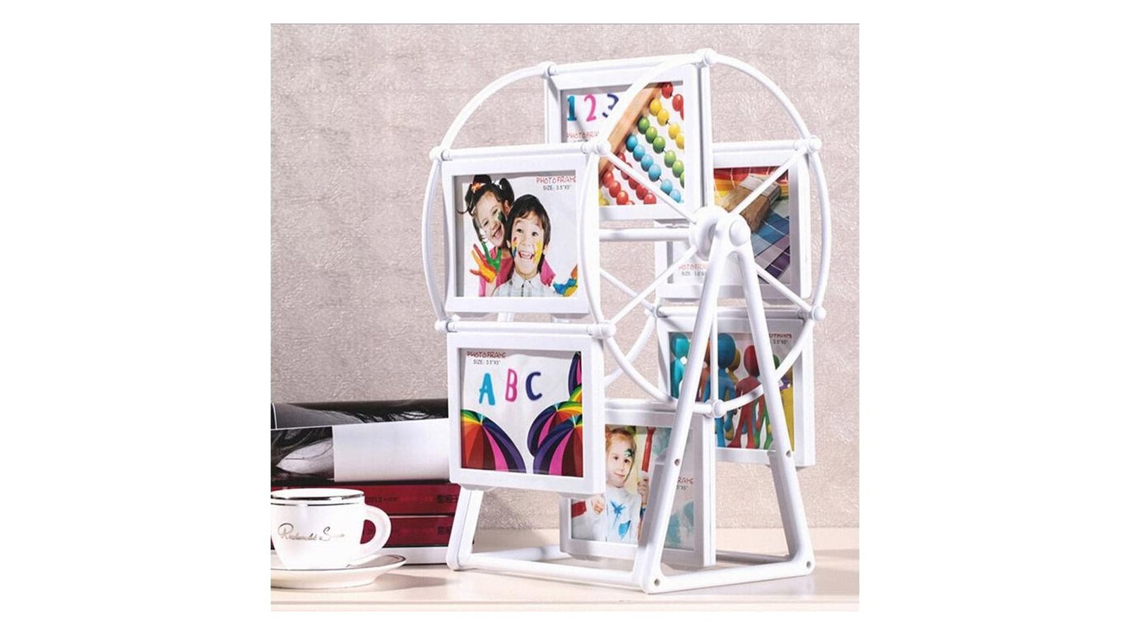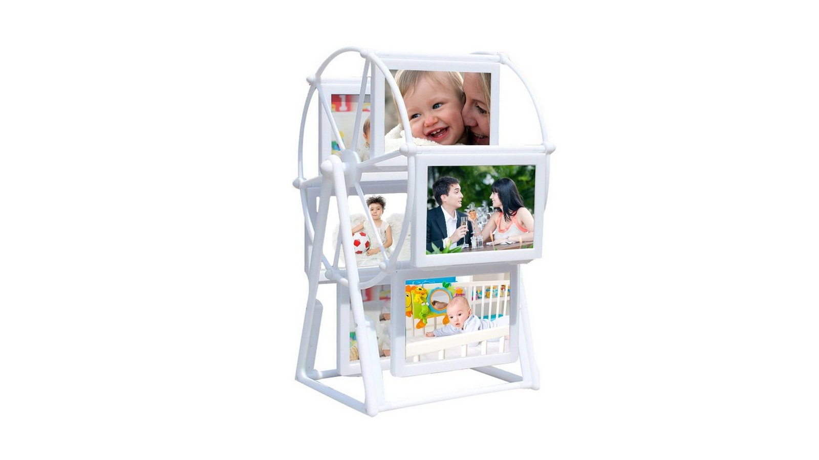 Carusel foto - colaj 12 poze Se pot introduce 12 poze de 13x9 cm Caruselul este fabricat din plastic și se comercializează dezasamblat și este împachetat în cutie de carton și folie de plastic pentru fiecare piesă Cutia conține și șuruburile necesare asamblării, fiind nevoie pentru a asambla acest produs doar de o șurubelniță mică și 5 minute din timpul dumneavoastră Poate fi folosit ca și cadou de casă noua, Crăciun, Paște, zi de naștere, ziua mamei, ziua tatalui, aniversare, etc.