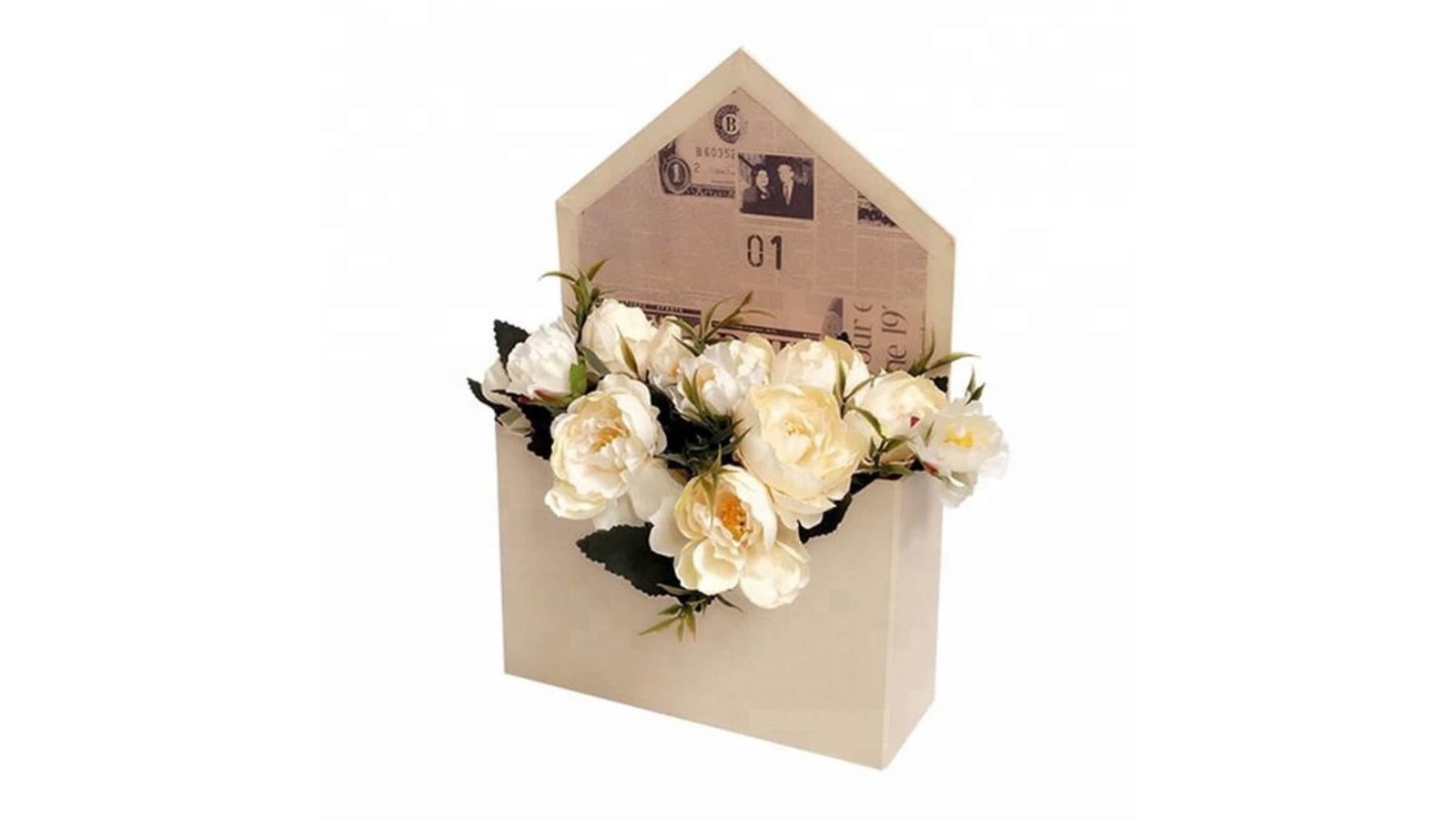 Cutie solidă tip plic - beige ziar, dimensiune totală 20x13,5x30cm se poate folosi pentru ambalaje de flori, buchete, cadouri, mărturii, produse handmade, decorațiuni și multe altele perfectă pentru evenimente cum ar fi: nunți, botezuri, Crăciun, Paște, Valentine's Day, mărțișor, 8 martie, petreceri pentru copii, zile de naștere, etc. interior rezistent la apă