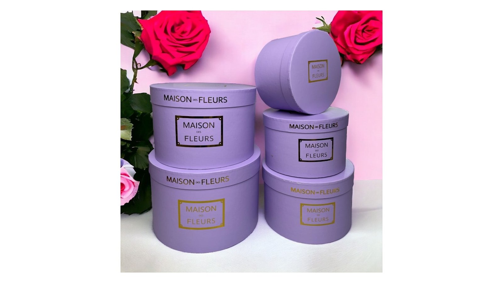 Set 5 cutii Maison des Fleurs - mov deschis se pot folosi pentru ambalaje de flori, buchete, trandafiri, cadouri, mărturii, produse handmade, decorațiuni și multe altele perfecte pentru evenimente cum ar fi: nunți, botezuri, Crăciun, Paște, Valentine's Day, mărțișor, 8 martie, petreceri pentru copii, zile de naștere, etc. set 5 cutii de dimensiuni diferite