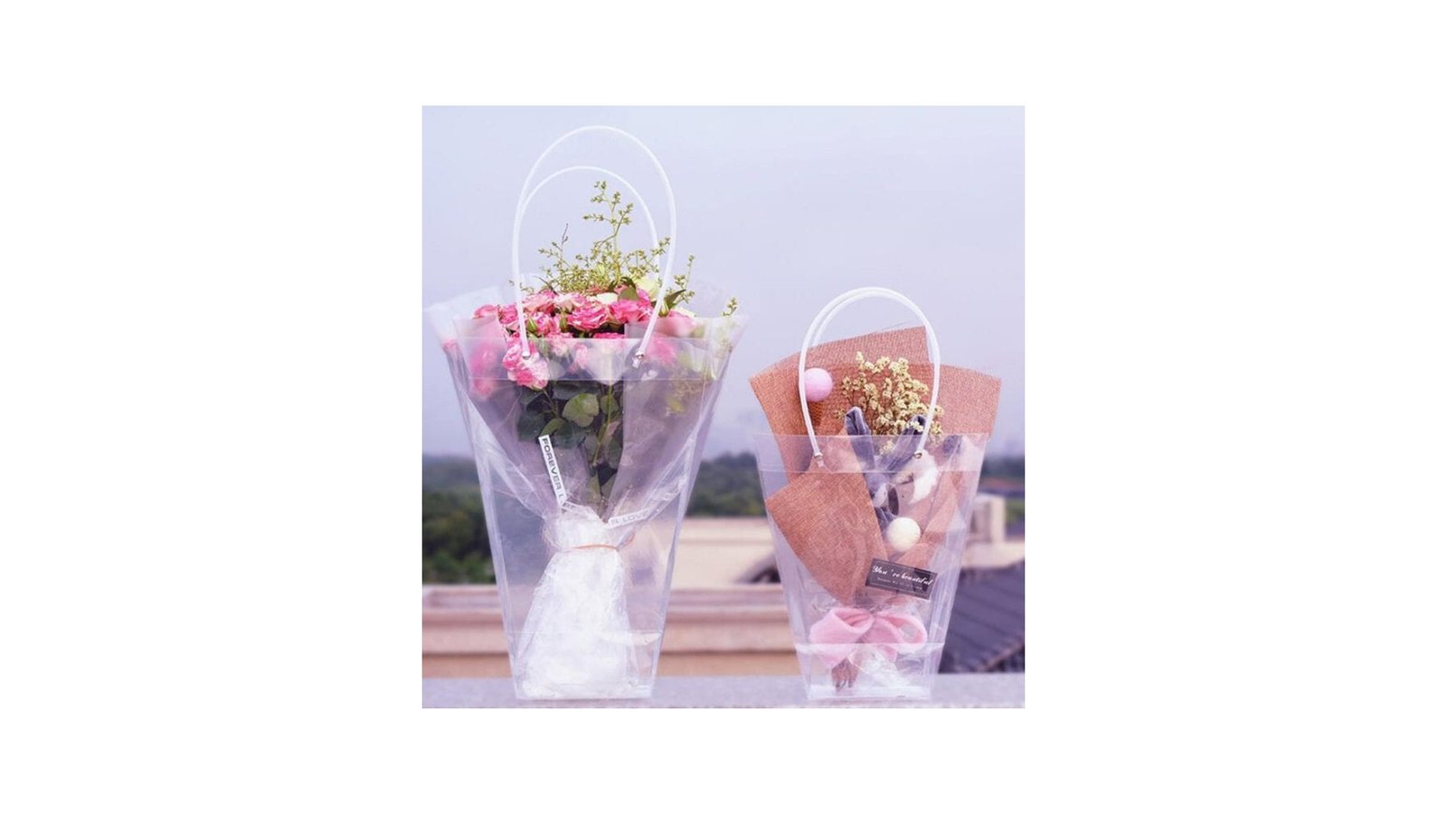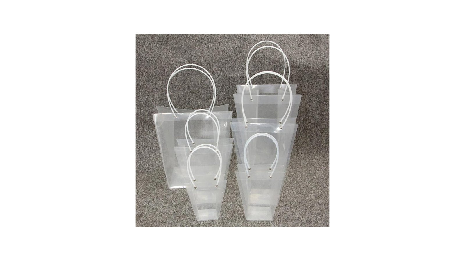Sacoșe ghiveci transparente, de diferite dimensiuni se pot folosi pentru ambalaje de flori, buchete, ghivece, cadouri, mărturii, produse handmade, decorațiuni și multe altele perfecte pentru evenimente cum ar fi: nunți, botezuri, Crăciun, Paște, Valentine's Day, mărțișor, 8 martie, petreceri pentru copii, zile de naștere, etc. rezistente la apă pliabile Sacoșele se livrează pliate pentru a economisi spațiu.