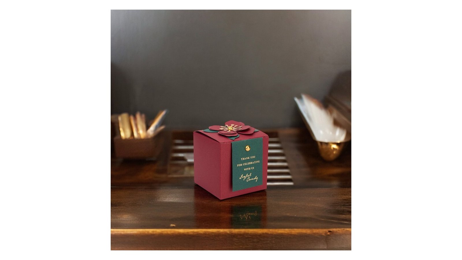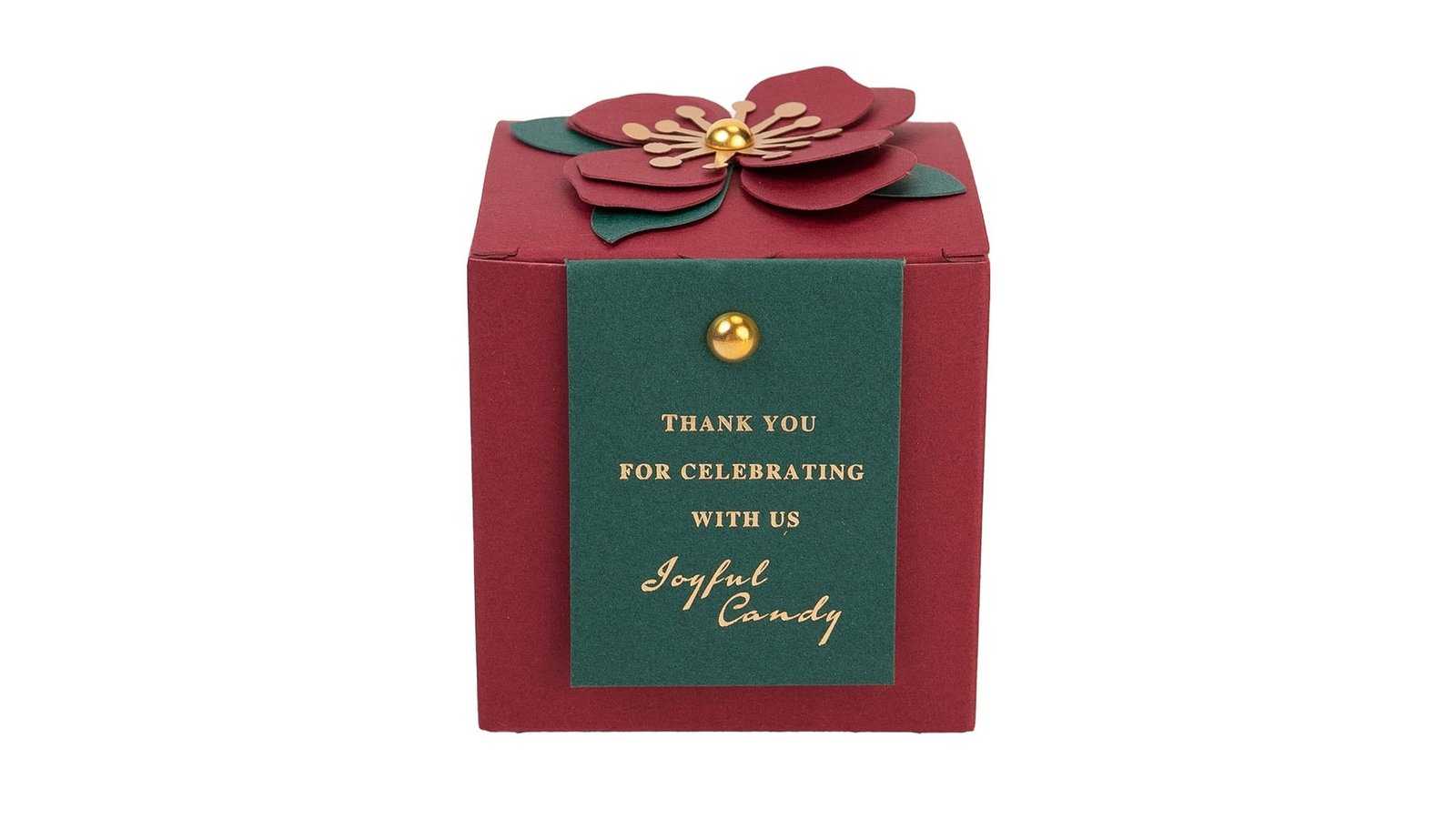 Cutie mică cu floare 3D și mesaj - vișiniu-verde, îmbină eleganța cu recunoștința într-un design deosebit. Floarea 3D și mesajul de mulțumire, oferă o modalitate unică și rafinată de a exprima aprecierea. Caracteristici: Floare 3D decorativă pe capac Etichetă verde cu mesaj de mulțumire auriu Detalii aurii (centrul florii și butonul etichetei) Utilizare: Ambalaj pentru bomboane sau dulciuri ca favor de nuntă Cutie cadou pentru bijuterii mici Decor de masă la evenimente festive Ambalaj de cadou pentru colegi sau persoanele dragi Beneficii: Design elegant și memorabil pentru ocazii speciale Combină funcționalitatea cu un aspect decorativ deosebit Oferă o modalitate unică de a exprima recunoștința
