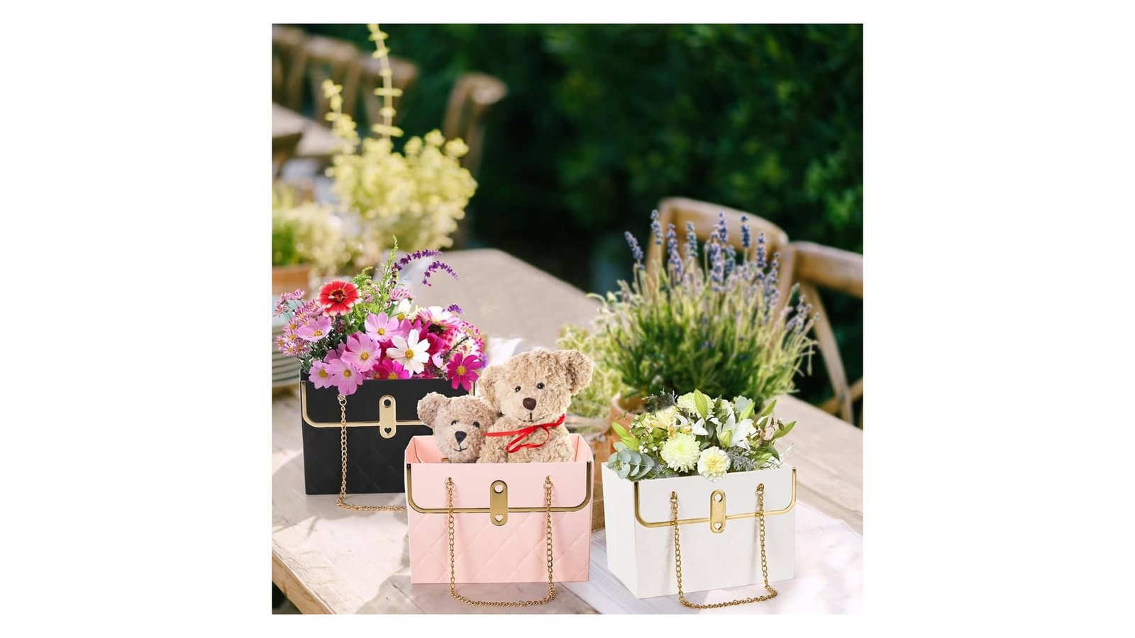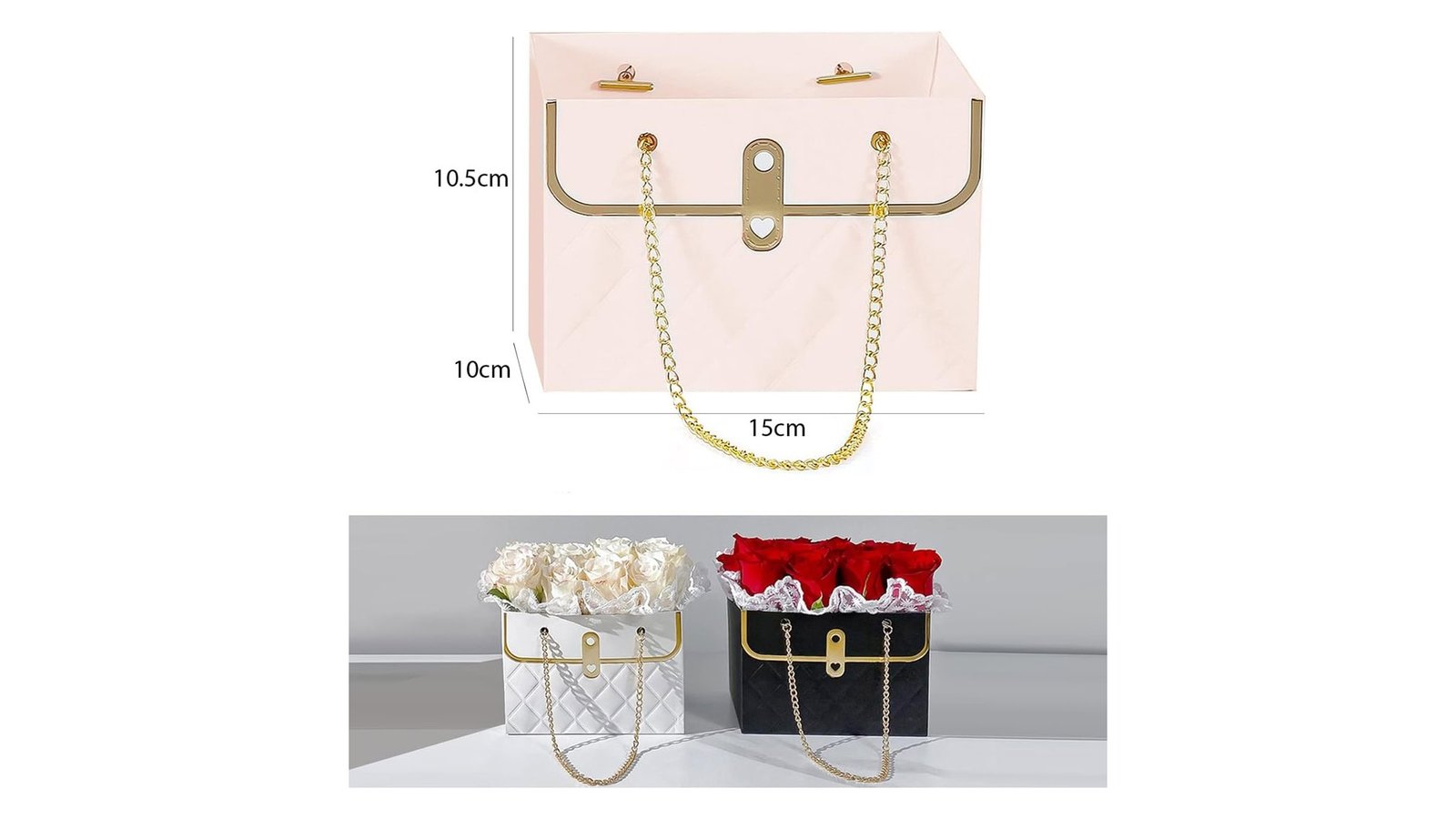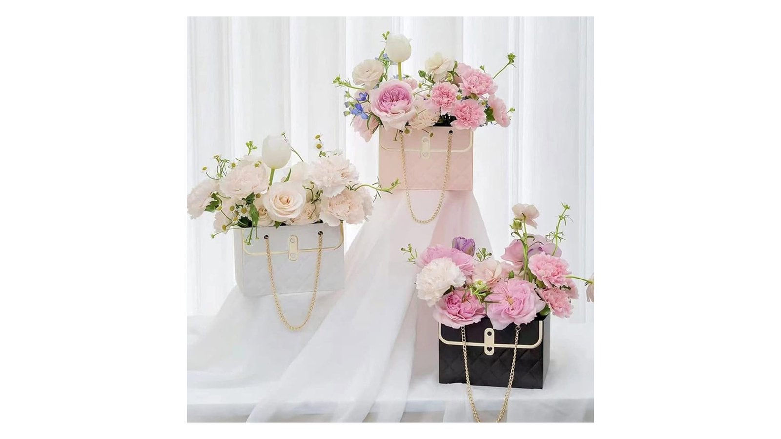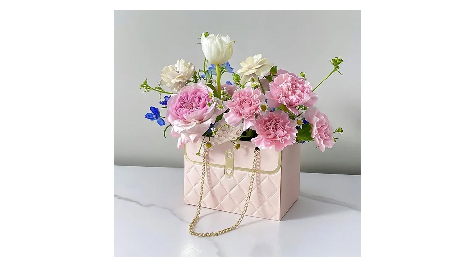 Gentuță model romburi cu lănțișor auriu - roz, inspirată de designul unei gentuțe, oferă o prezentare unică pentru aranjamentele florale. Acest recipient devine un accesoriu perfect pentru decorațiuni interioare și evenimente speciale. Caracteristici: Design atractiv cu model de romburi în relief Lănțișor auriu decorativ Deschidere largă în partea superioară pentru aranjarea florilor Disponibilă în trei culori: alb, roz pal și negru Utilizare: Crearea aranjamentelor florale pentru acasă, vitrine de magazine Decorațiuni de masă pentru nunți sau alte evenimente Centerpiece-uri elegante pentru recepții Cadouri florale personalizate Beneficii: Oferă o prezentare unică și elegantă pentru flori Versatilitate în decorare datorită designului și culorilor neutre Rezistență la apă, protejând suprafe