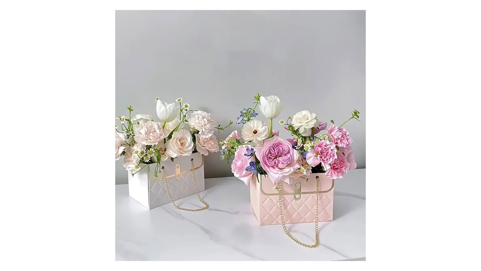 Gentuță model romburi cu lănțișor auriu - roz, inspirată de designul unei gentuțe, oferă o prezentare unică pentru aranjamentele florale. Acest recipient devine un accesoriu perfect pentru decorațiuni interioare și evenimente speciale. Caracteristici: Design atractiv cu model de romburi în relief Lănțișor auriu decorativ Deschidere largă în partea superioară pentru aranjarea florilor Disponibilă în trei culori: alb, roz pal și negru Utilizare: Crearea aranjamentelor florale pentru acasă, vitrine de magazine Decorațiuni de masă pentru nunți sau alte evenimente Centerpiece-uri elegante pentru recepții Cadouri florale personalizate Beneficii: Oferă o prezentare unică și elegantă pentru flori Versatilitate în decorare datorită designului și culorilor neutre Rezistență la apă, protejând suprafețele de eventuale scurgeri Reutilizabil pentru diverse ocazii și stiluri de decor