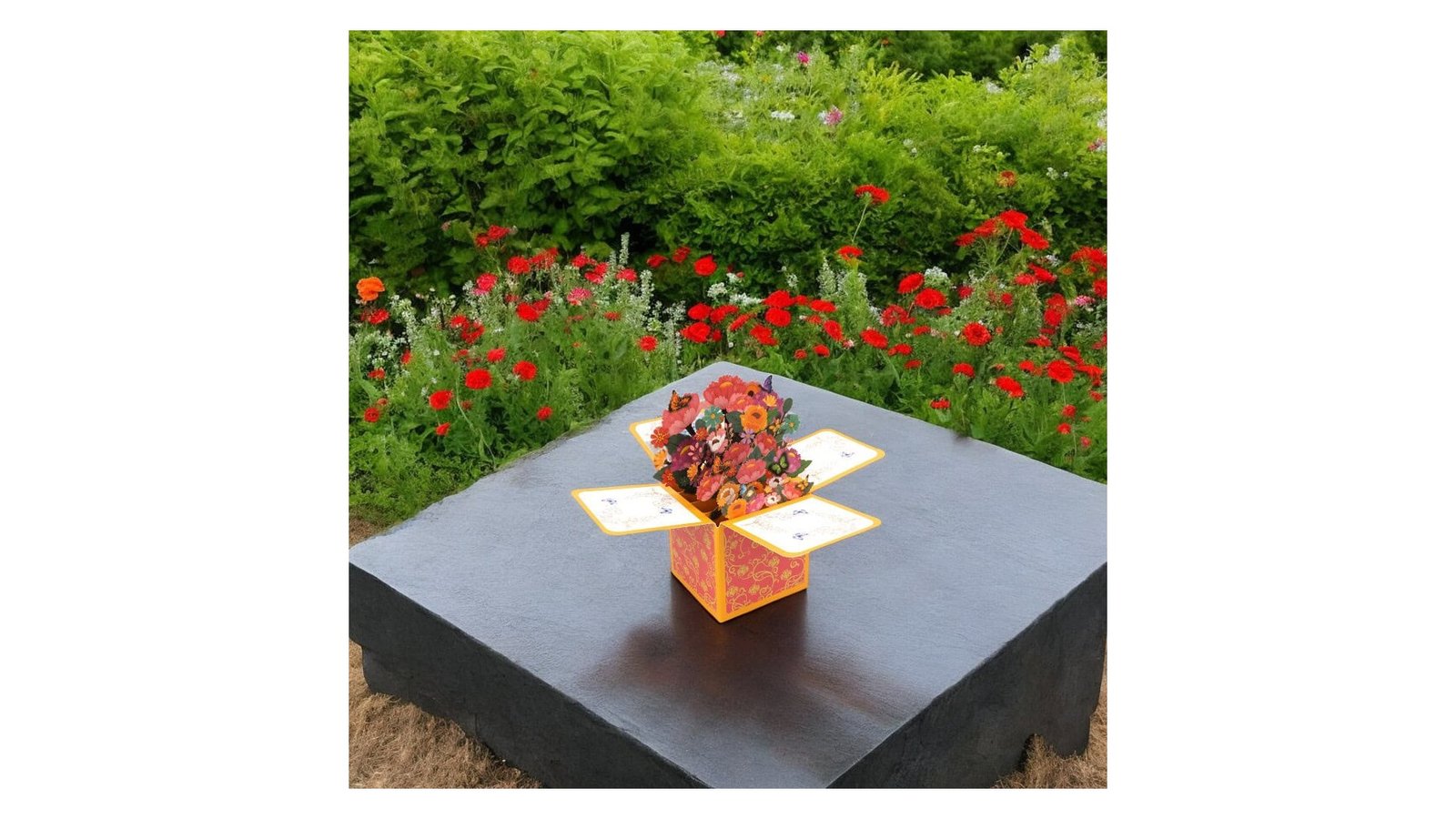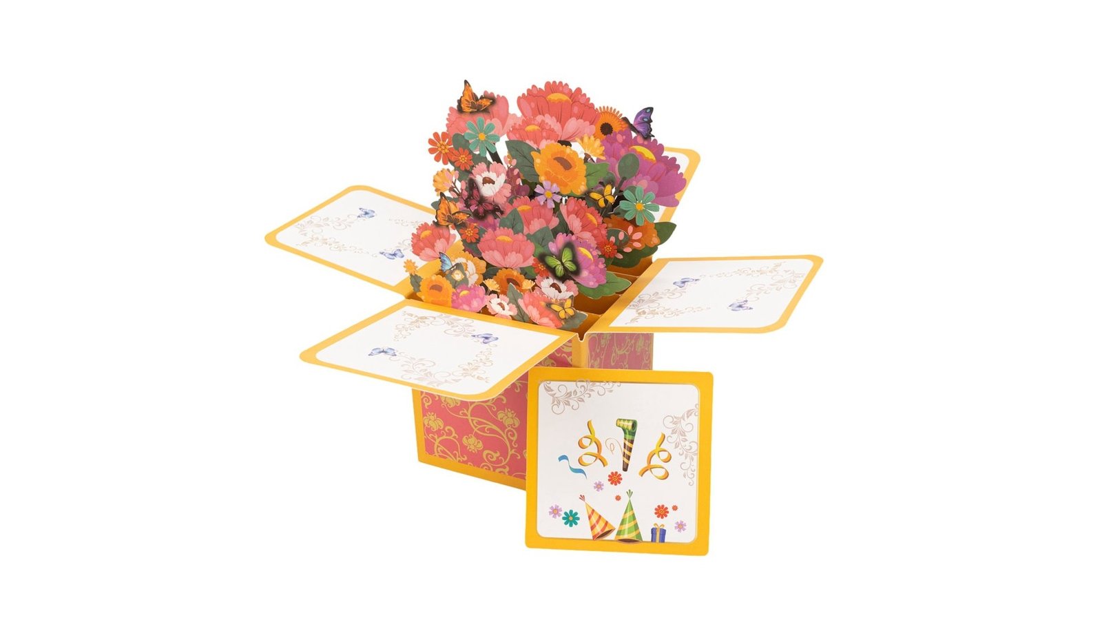 Felicitare explozivă 3D - model 1, o felicitare interactivă și spectaculoasă, care se deschide pentru a dezvălui un buchet colorat de flori tridimensionale. Designul combină elemente florale cu fluturi și detalii decorative, totul într-o prezentare care surprinde și încântă prin efectul său pop-up. Caracteristici: Design pliabil 3D care se deschide într-un aranjament floral complex Elemente decorative precum fluturi și ornamente florale pe exteriorul cutiei Mesaj personalizabil pe panoul frontal, cu tematică de sărbătoare Utilizare: Felicitare unică pentru diverse ocazii (zile de naștere, mulțumiri, felicitări) Decorațiune de masă pentru evenimente speciale Cadou surpriză pentru iubitorii de flori sau artă Invitație specială pentru evenimente importante Beneficii: Oferă o experiență vizual