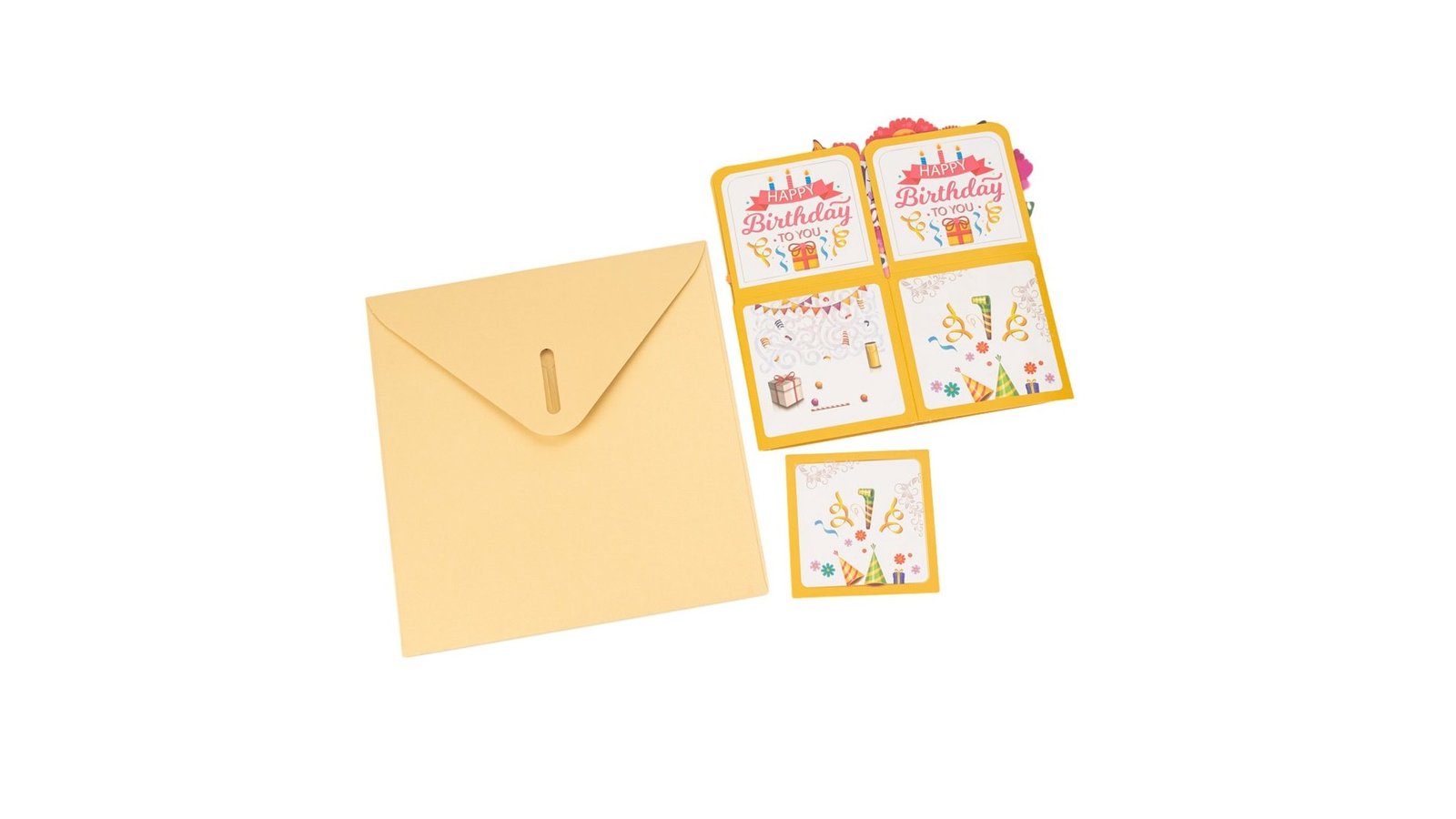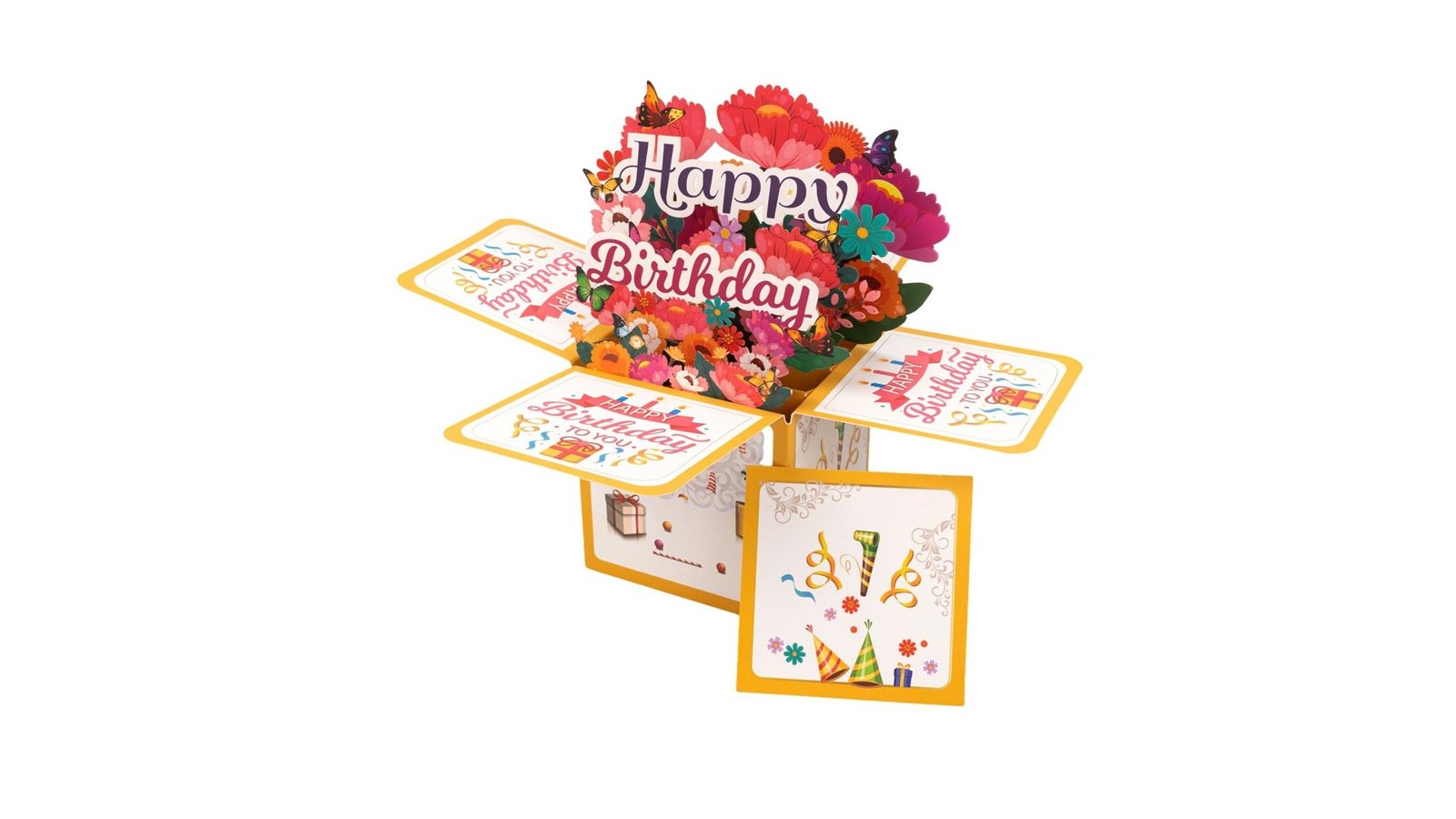 Felicitare explozivă 3D - model 4, este o felicitare pop-up 3D spectaculoasă pentru aniversări. Designul său prezintă o explozie de flori și fluturi care ies din cutie atunci când este deschisă, creând o surpriză vizuală impresionantă. Felicitarea combină culori vibrante, forme variate și detalii strălucitoare pentru a transmite un mesaj de sărbătoare memorabil. Caracteristici: Design pop-up 3D Temă de petrecere aniversară cu elemente festive variate Include banner "Happy Birthday" și diverse decorațiuni de petrecere Utilizare: Felicitare de aniversare pentru prieteni sau familie Invitație specială pentru o petrecere aniversară Decor de masă pentru o petrecere Element decorativ pentru vitrina unui magazin de cadouri Beneficii: Oferă o experiență vizuală unică și memorabilă pentru destinata