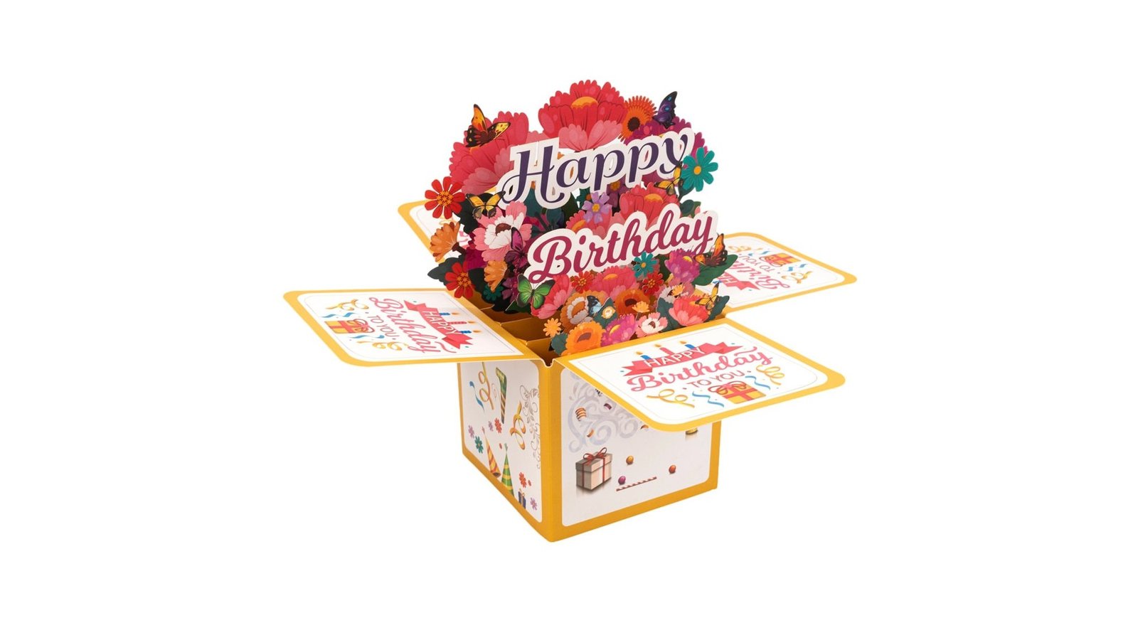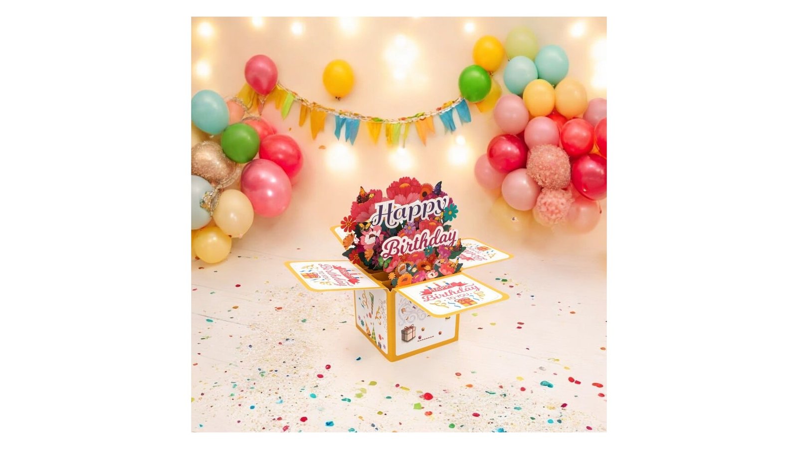Felicitare explozivă 3D - model 4, este o felicitare pop-up 3D spectaculoasă pentru aniversări. Designul său prezintă o explozie de flori și fluturi care ies din cutie atunci când este deschisă, creând o surpriză vizuală impresionantă. Felicitarea combină culori vibrante, forme variate și detalii strălucitoare pentru a transmite un mesaj de sărbătoare memorabil. Caracteristici: Design pop-up 3D Temă de petrecere aniversară cu elemente festive variate Include banner "Happy Birthday" și diverse decorațiuni de petrecere Utilizare: Felicitare de aniversare pentru prieteni sau familie Invitație specială pentru o petrecere aniversară Decor de masă pentru o petrecere Element decorativ pentru vitrina unui magazin de cadouri Beneficii: Oferă o experiență vizuală unică și memorabilă pentru destinatar Economisește timp și efort în decorarea unei petreceri aniversare Poate fi păstrată ca suvenir după eveniment Transmite un mesaj personalizat într-un mod creativ și impactant
