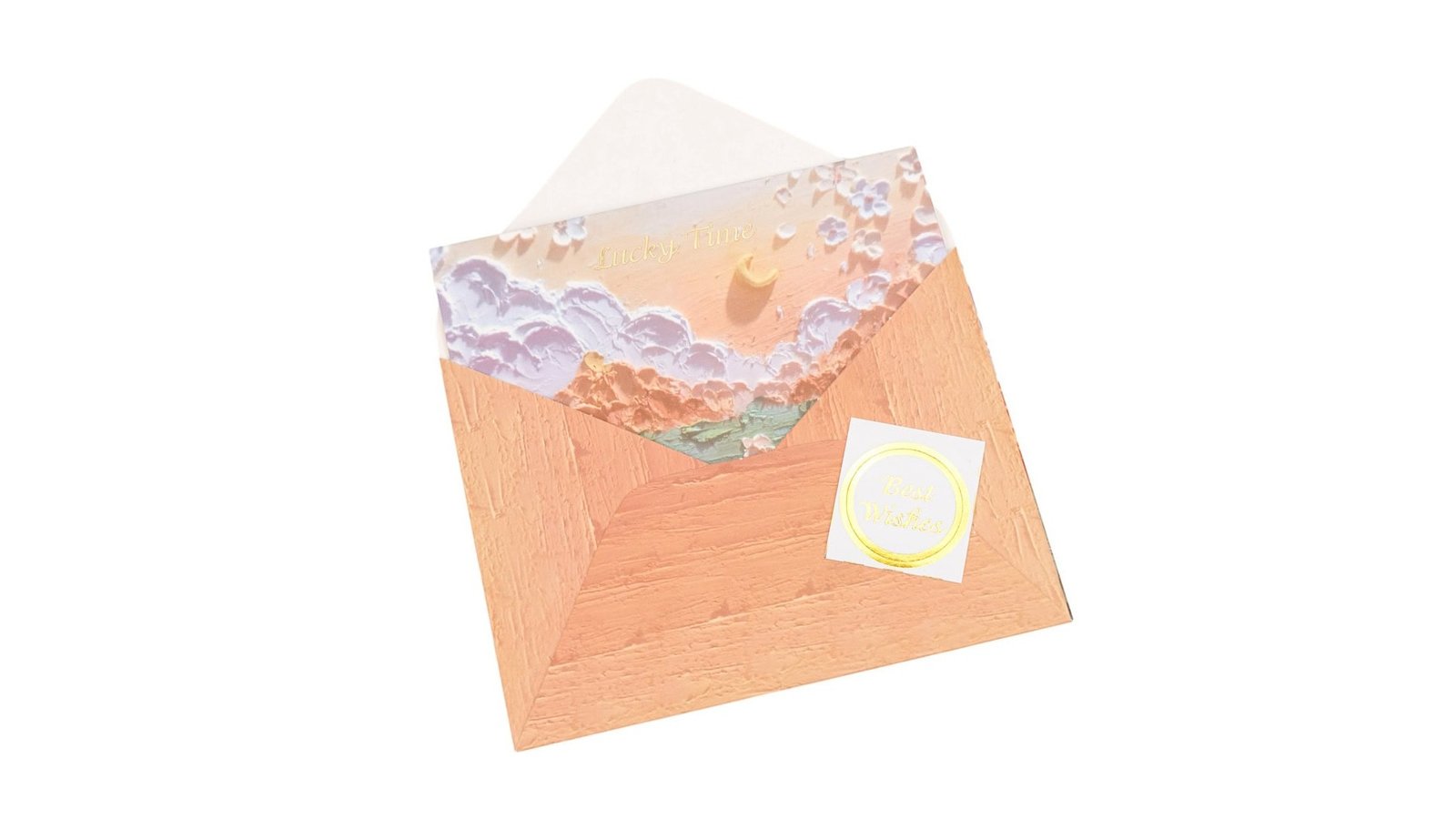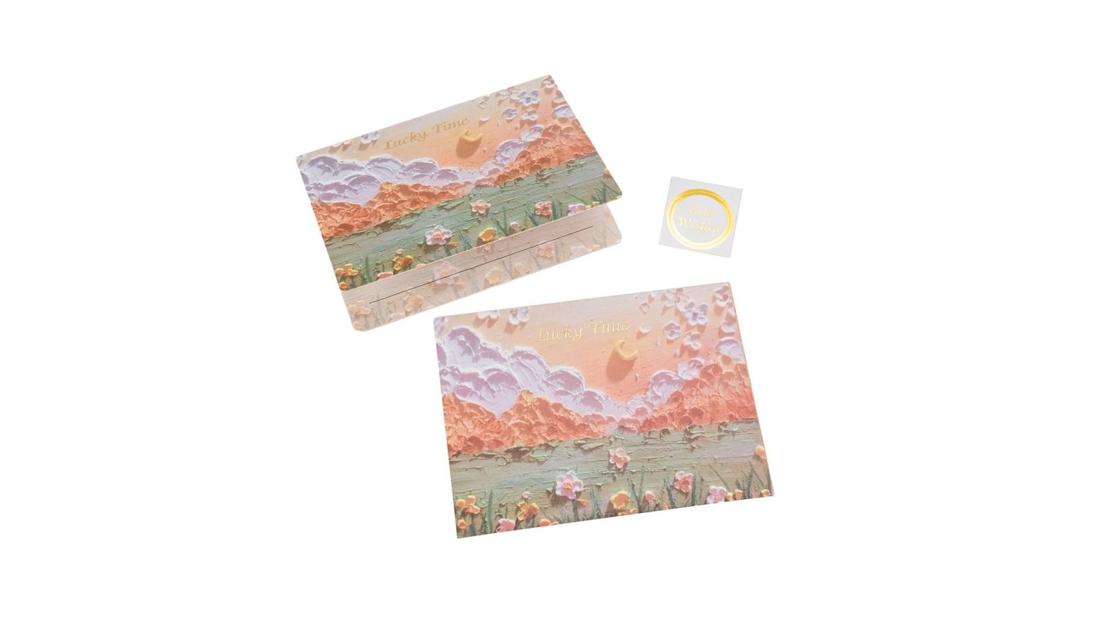Felicitare stil pictură cu plic și sticker Best Wishes - model 2 este o felicitare unică, inspirată de arta picturii, adaugă o notă de eleganță și originalitate oricărui mesaj. Cu designul său artistic și textul emoționant, felicitarea este perfectă pentru a exprima sentimente sincere și a marca momente speciale. Caracteristici: Design artistic: Felicitarea prezintă o reproducere a unei picturi, capturând frumusețea naturii Mesaj personal: Fraza "Lucky time" (Timp norocos) adaugă o notă personală și sentimentală mesajului Plic în ton cu felicitarea: Plicul inclus are un design simplu, care completează estetica generală a felicitării Sticker decorativ: Stickerul "Best Wishes" (Cele mai bune urări) adaugă un detaliu elegant și permite personalizarea mesajului Utilizare: Felicitări: Perfectă