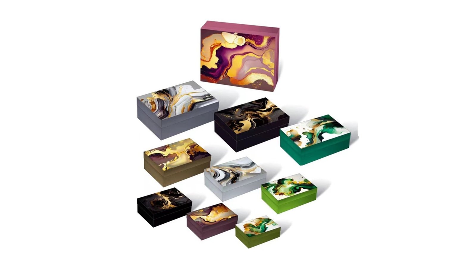 Set 10 cutii dreptunghiulare diferite - model 1 pictură, concepute pentru a adăuga o notă de eleganță și rafinament oricărui cadou sau spațiu. Fiecare cutie are un design abstract, inspirat de arta marmurului, cu nuanțe vibrante și modele unice, care creează un aspect luxos și modern. Perfect pentru cei care caută ambalaje deosebite și soluții de organizare cu stil. Caracteristici: Fiecare cutie are un design original, inspirat de arta marmurului, cu combinații de culori vibrante și modele fluide. Setul include 10 cutii de diferite dimensiuni, oferind flexibilitate în funcție de nevoile tale. Cutiile sunt fabricate dintr-un carton robust, care protejează designul și asigură durabilitate. Utilizare: Crearea de pachete cadou personalizate pentru ocazii speciale Perfect pentru a depozita biju