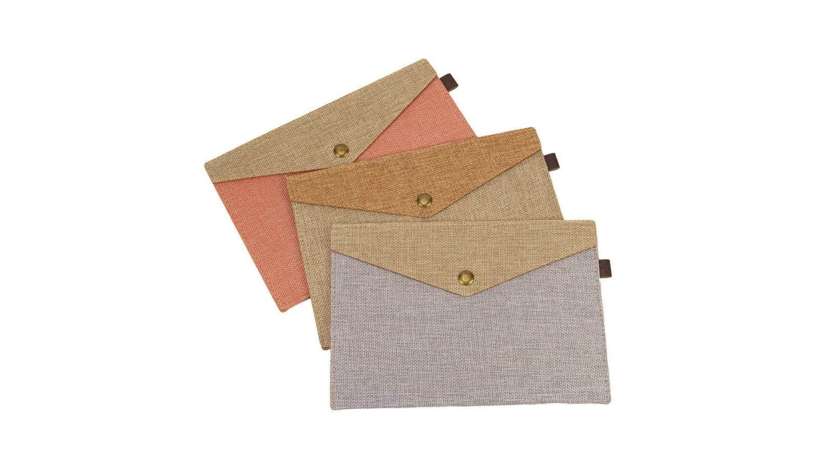 Plic textil cu capsă magnetică - bej este un produs elegant și funcțional, acest plic textil este soluția perfectă pentru organizarea documentelor, a accesoriilor mici sau chiar a unor mici cadouri. Confecționat dintr-un material textil durabil și plăcut la atingere, plicul îmbină estetica minimalistă cu practicabilitatea de zi cu zi Caracteristici: Închidere sigură: Capsa magnetică asigură o închidere discretă și eficientă, protejând conținutul de pierdere sau deteriorare Design versatil: Forma dreptunghiulară și dimensiunile generoase îl fac potrivit pentru o gamă variată de obiecte, de la cărți de vizită și pixuri până la mici gadgeturi Material de calitate: Tesatura textilă este rezistentă la uzură și ușor de curățat, asigurând o durată lungă de viață Utilizare: Organizare birou: Ideal