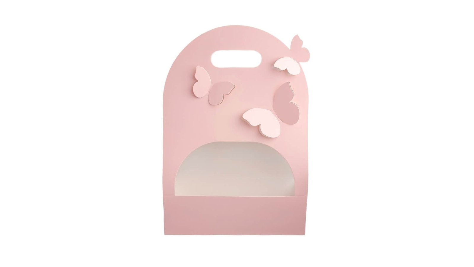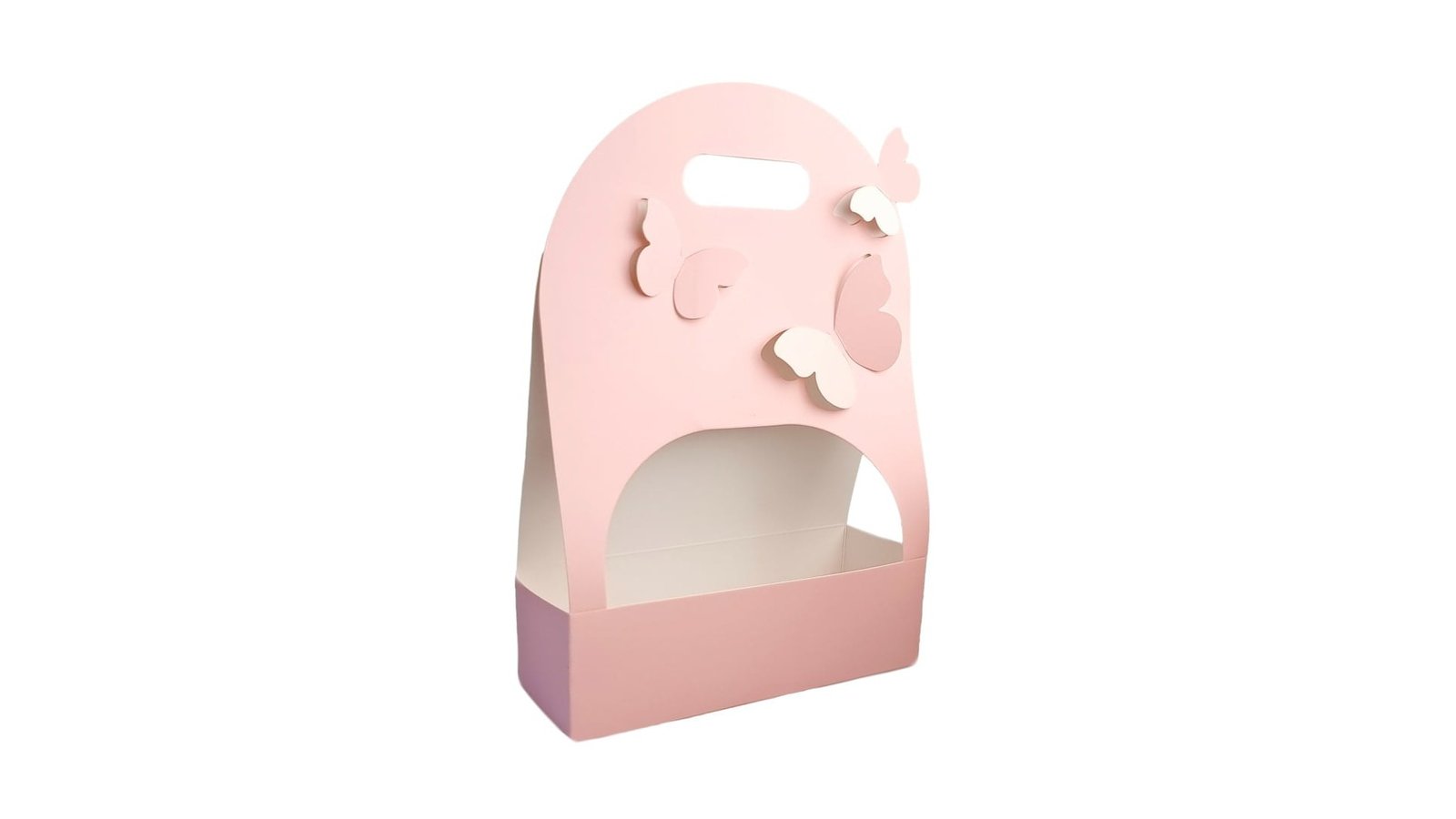 Cutie dreptunghiulară cu mâner și fluturași - roz se pot folosi pentru ambalaje de flori, buchete, cadouri, mărturii, produse handmade, decorațiuni și multe altele perfecte pentru evenimente cum ar fi: nunți, botezuri, Crăciun, Paște, Valentine's Day, mărțișor, 8 martie, petreceri pentru copii, zile de naștere, etc. Cutiile se livrează pliate pentru a economisi spațiu.