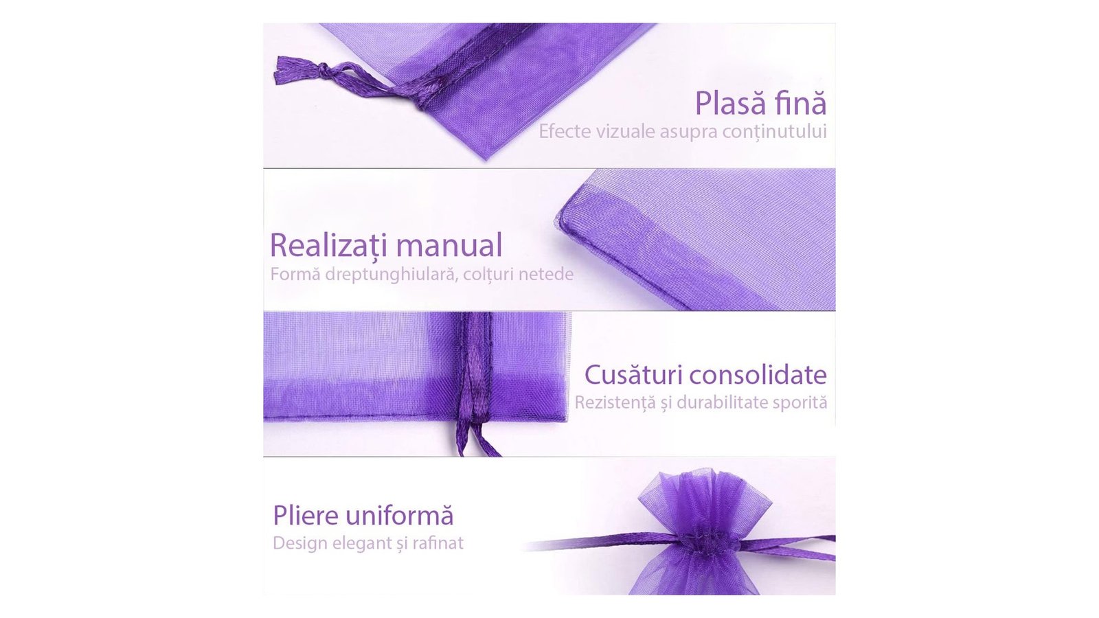 Săculeți organza cu șnur satin 12x17cm - Descoperiți o modalitate elegantă și practică de a prezenta, proteja și decora, aducând un plus de rafinament oricărei ocazii. Caracteristici: Material organza durabil și transparent: Rezistenți la uzură și permit vizibilitatea conținutului din interior Varietate de culori: Alegeți dintre o gamă largă de culori pentru a se potrivi perfect cu orice ocazie Șnur satin fin: Un șnur satin delicat asigură o închidere sigură și elegantă a fiecărui săculeț. Utilizări: Ambalare cadouri cu stil: săpunuri artizanale, lumânări parfumate, potpourri de lavandă, bijuterii delicate , cosmetice sau alte obiecte personale Decorațiuni rafinate: Adăugați o notă de eleganță decorului dumneavoastră pentru nunți, petreceri de aniversare, botezuri sau alte evenimente speci
