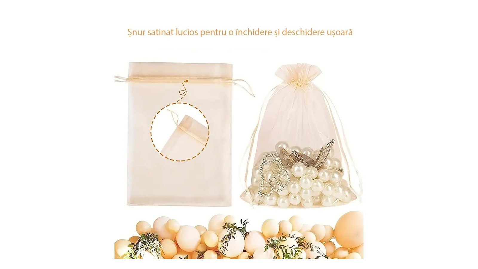 Săculeți organza cu șnur satin 12x17cm - Descoperiți o modalitate elegantă și practică de a prezenta, proteja și decora, aducând un plus de rafinament oricărei ocazii. Caracteristici: Material organza durabil și transparent: Rezistenți la uzură și permit vizibilitatea conținutului din interior Varietate de culori: Alegeți dintre o gamă largă de culori pentru a se potrivi perfect cu orice ocazie Șnur satin fin: Un șnur satin delicat asigură o închidere sigură și elegantă a fiecărui săculeț. Utilizări: Ambalare cadouri cu stil: săpunuri artizanale, lumânări parfumate, potpourri de lavandă, bijuterii delicate , cosmetice sau alte obiecte personale Decorațiuni rafinate: Adăugați o notă de eleganță decorului dumneavoastră pentru nunți, petreceri de aniversare, botezuri sau alte evenimente speciale. Beneficii: Versatil pentru diverse ocazii și utilizări: De la ambalarea cadourilor la organizarea personală și decorarea evenimentelor, sunt o alegere versatilă pentru o varietate de nevoi. Material durabil și reutilizabil: Confecționați din organza de calitate, pot fi utilizați de mai multe ori, oferindu-vă o modalitate ecologică și economică de ambalare și decorare. Săculeții sunt realizați de mână, iar din această cauză dimensiunea poate varia puțin.