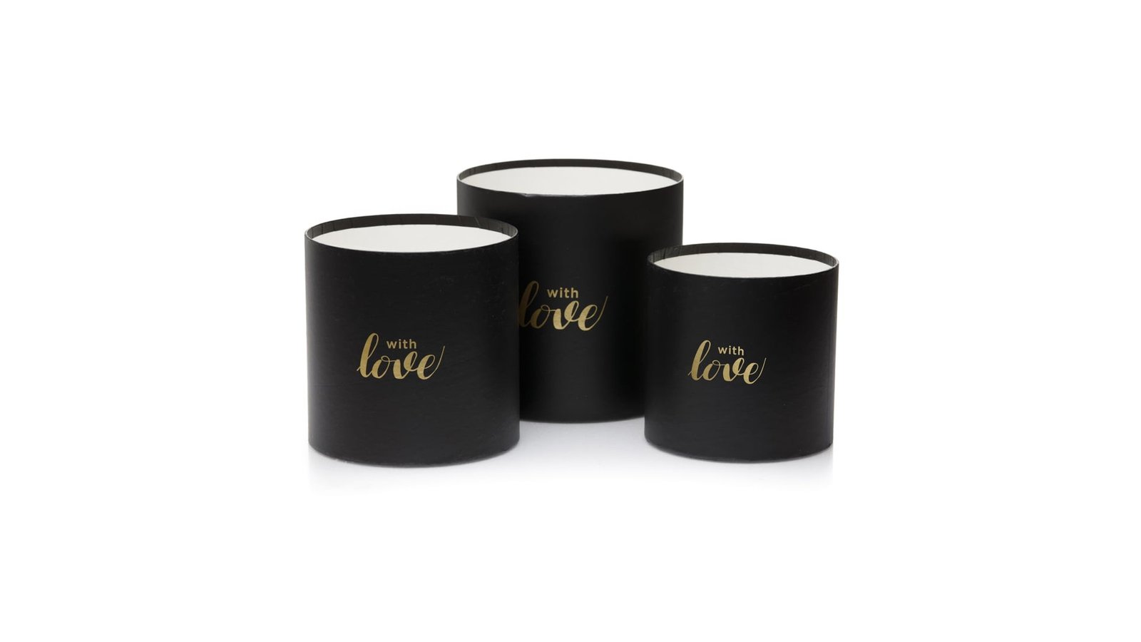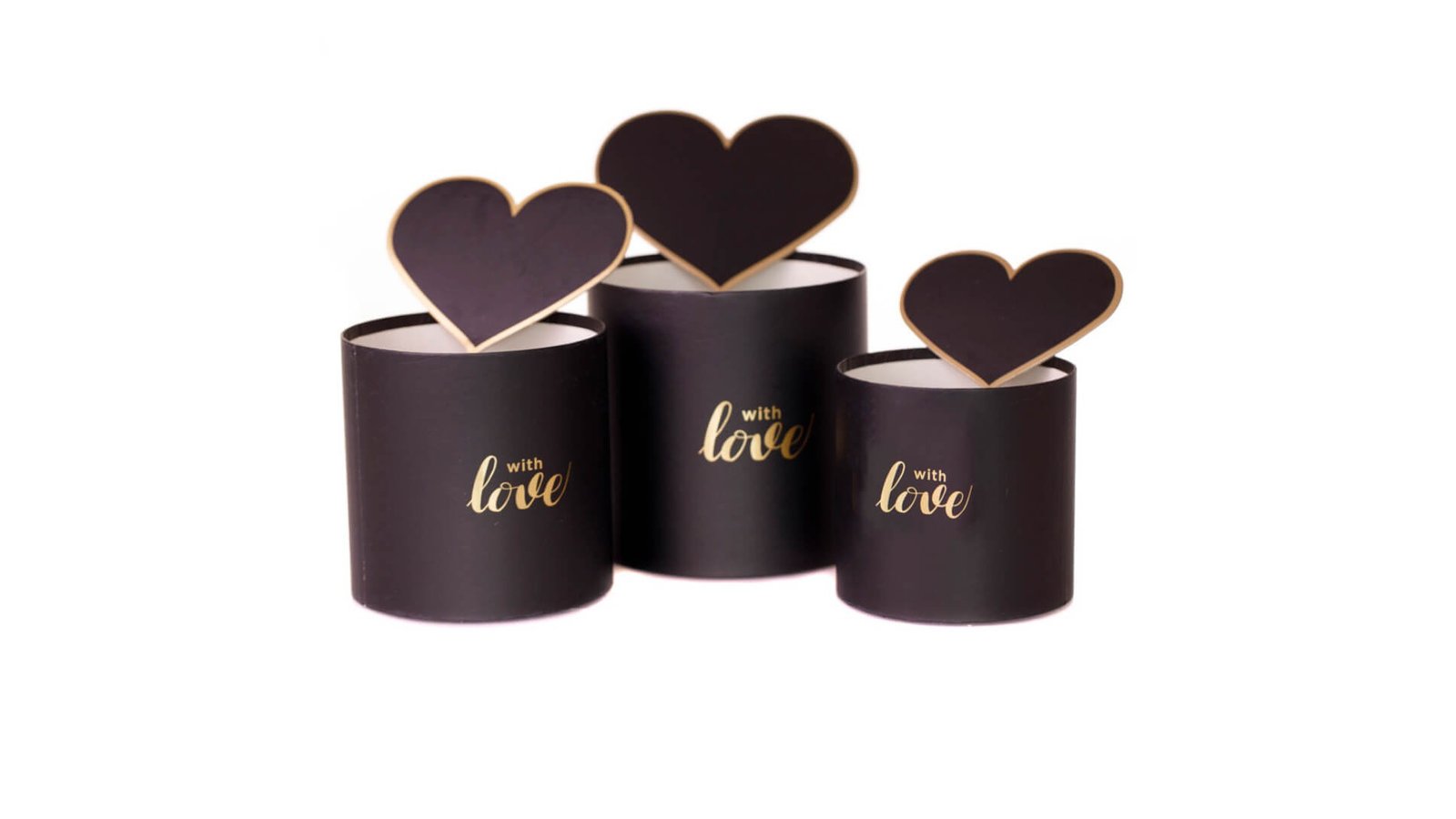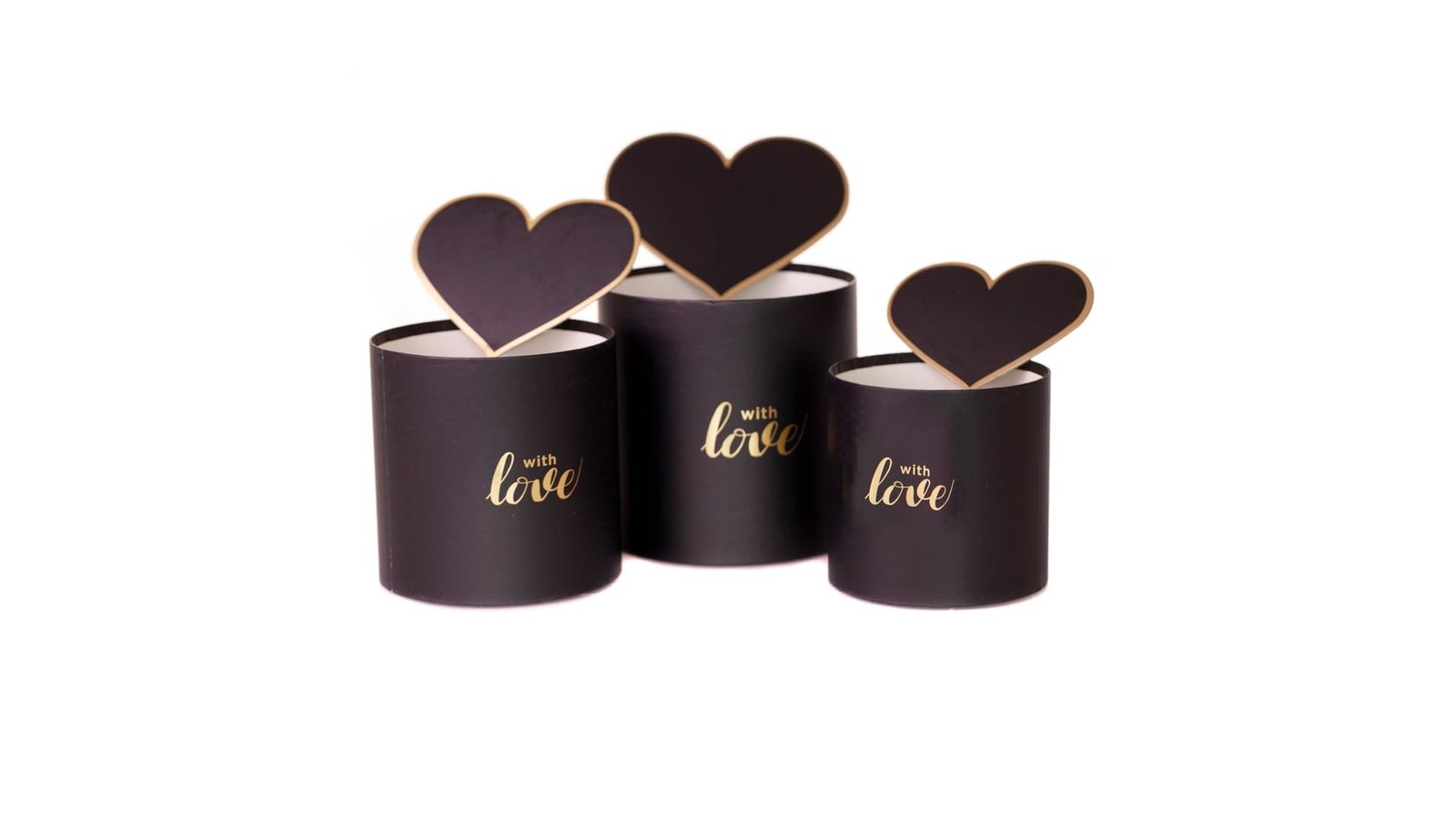 Set 3 cutii rotunde cu inimi - model with love negru se pot folosi pentru ambalaje de flori, buchete, trandafiri, cadouri, mărturii, produse handmade, decorațiuni și multe altele perfecte pentru evenimente cum ar fi: nunți, botezuri, Crăciun, Paște, Valentine's Day, mărțișor, 8 martie, petreceri pentru copii, zile de naștere, etc. accesorii inimioare incluse