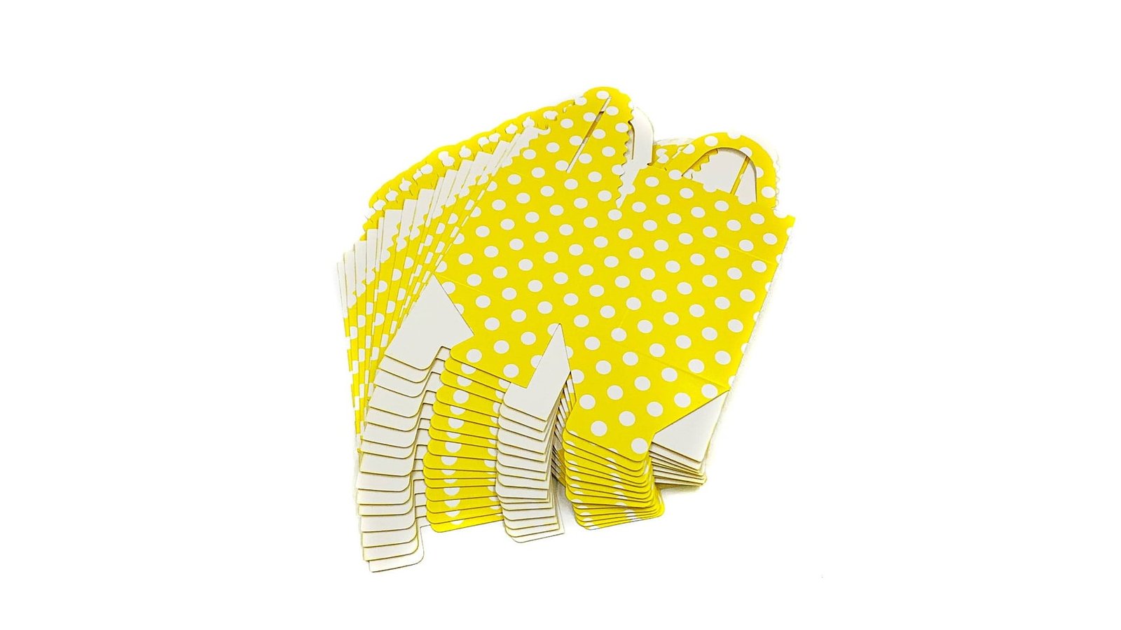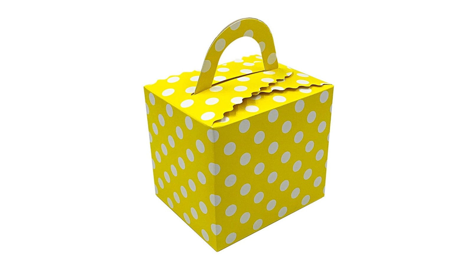 Cutie pătrată cu buline - galben cutie din carton, folosită in principal pentru ambalarea cănilor, dar se poate folosi și pentru alte obiecte, cum ar fi: flori, cadouri, mărturii, produse handmade, decorațiuni și multe altele perfectă pentru evenimente cum ar fi: nunți, botezuri, Crăciun, Paște, Valentine’s Day, mărțișor, 8 martie, petreceri pentru copii, zile de naștere, etc. Cutiile se comercializează dezasamblate pentru a economisi spațiu.