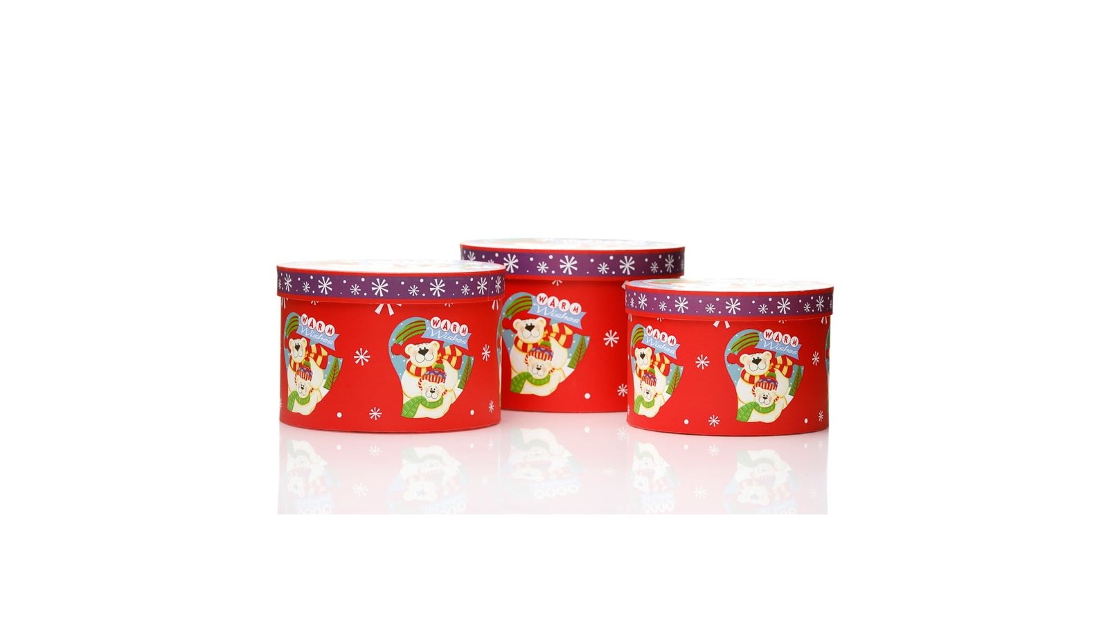 Set 3 cutii rotunde Crăciun - model urși polari se pot folosi pentru ambalaje de flori, buchete, cadouri, produse handmade, decorațiuni și multe altele perfecte pentru evenimente cum ar fi: Crăciun, Moș Nicolae, petreceri pentru copii, zile de naștere, etc.