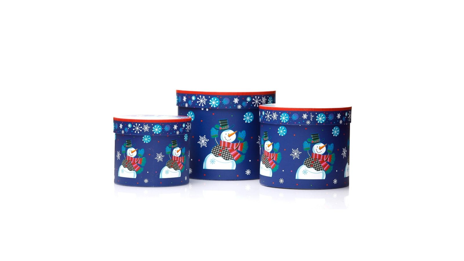 Set 3 cutii rotunde Crăciun - model om de zăpadă se pot folosi pentru ambalaje de flori, buchete, cadouri, produse handmade, decorațiuni și multe altele perfecte pentru evenimente cum ar fi: Crăciun, Moș Nicolae, petreceri pentru copii, zile de naștere, etc.