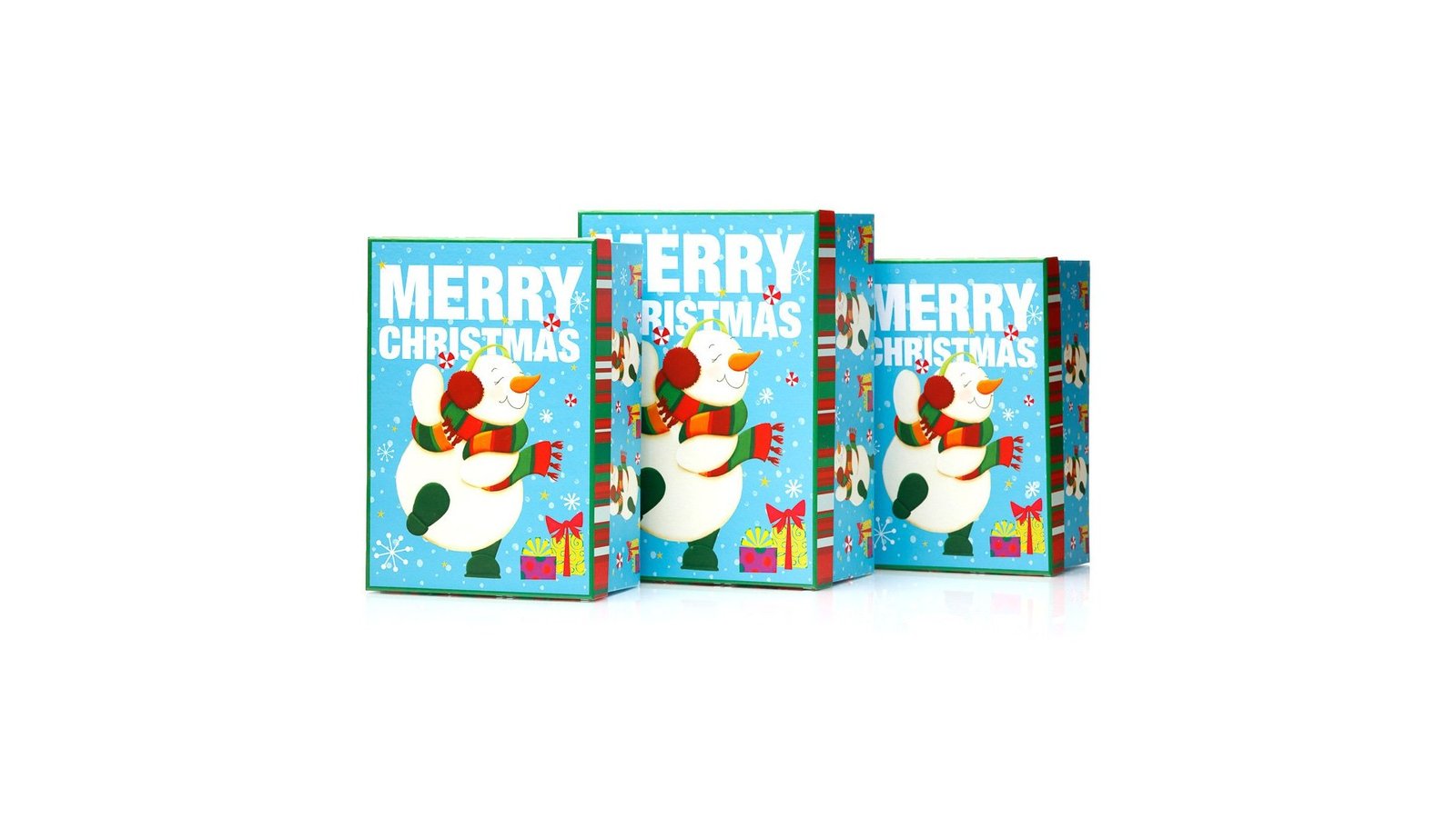 Set 3 cutii dreptunghiulare Crăciun – model om de zăpadă fericit se pot folosi pentru ambalaje de flori, buchete, cadouri, produse handmade, decorațiuni și multe altele perfecte pentru evenimente cum ar fi: Crăciun, Moș Nicolae, petreceri pentru copii, zile de naștere, etc.