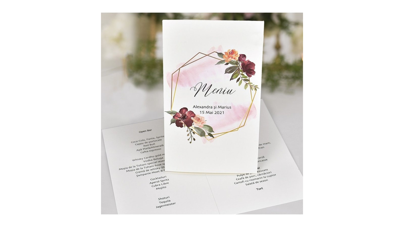 Succesul realizarii unui eveniment fara cusur consta in atentia la detalii, cum ar fi meniurile. De aceea va propunem, [page_title] produsul ideal pentru un aranjament perfect al mesei. Modelele concepute de noi sunt de cea mai inalta calitate, personalizate si lucrate manual. Cum comand? Pentru a putea comanda trebuie sa urmati cativa pasi simpli: Alege varianta in care doresti sa achizitionezi meniurile: “Tiparite” sau “Tiparite si Asamblate”. Completeaza formularul cu detaliile evenimentului, disponibil in pagina de produs. Selecteaza cantitatea Plaseaza comanda Ce inseamna asamblare? Asamblarea consta in lipire, decupare, indoire, lipire accesorii, lipire funda, legare panglica etc. in functie de model. In cat timp este gata comanda? Timpul mediu de realizare este cuprins intre 5-7 zile lucratoare. Ce se intampla dupa ce ati plasat comanda? Un coleg va reveni la dvs. cu un apel telefonic pentru confirmarea comenzii. Dupa confirmarea telefonica, veti primi pe whatssapp/mail macheta meniului pentru verificarea acesteia. Doar dupa confirmarea dumneavoastra meniurile se vor tipari. Pentru text puteti alege orice culoare doriti, cu exceptia culorilor auriu si argintiu.