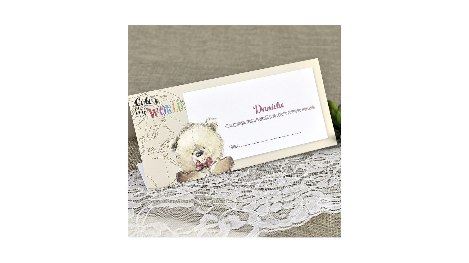 Succesul realizarii unui eveniment fara cusur consta in atentia la detalii, cum ar fi place cardul, plicul pentru bani sau cardurile cu nume. De aceea va propunem, [page_title] produsul ideal pentru un aranjament perfect al mesei. Modelele concepute de noi sunt de cea mai inalta calitate, personalizate si lucrate manual. Cum comand? Pentru a putea comanda trebuie sa urmati cativa pasi simpli: Alege varianta in care doresti sa achizitionezi: “Tiparite” sau “Tiparite si Asamblate”. Completeaza formularul cu detaliile evenimentului, disponibil in pagina de produs. Selecteaza cantitatea Plaseaza comanda Ce inseamna asamblare? Asamblarea consta in lipire, decupare, indoire, lipire accesorii, lipire funda, legare panglica etc in functie de model. Daca alegeti varianta de plic fara asamblare, trebuie sa aveti in vedere ca plicurile de bani nu vin cu banda dublu adeziva. In cat timp este gata comanda? Timpul mediu de realizare este cuprins intre 5-7 zile lucratoare. Ce se intampla dupa ce ati plasat comanda? Un coleg va reveni la dvs. cu un apel telefonic pentru confirmarea comenzii. Dupa confirmarea telefonica, veti primi pe whatssapp/mail macheta plicului pentru verificarea acesteia. Doar dupa confirmarea dumneavoastra plicurile se vor tipari. Pentru text puteti alege orice culoare doriti, cu exceptia culorilor auriu si argintiu.