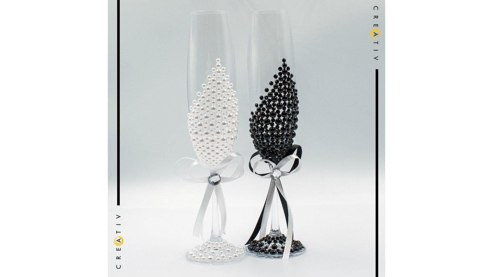 Pahare de sampanie pentru miri sau nasi perle alb si negru