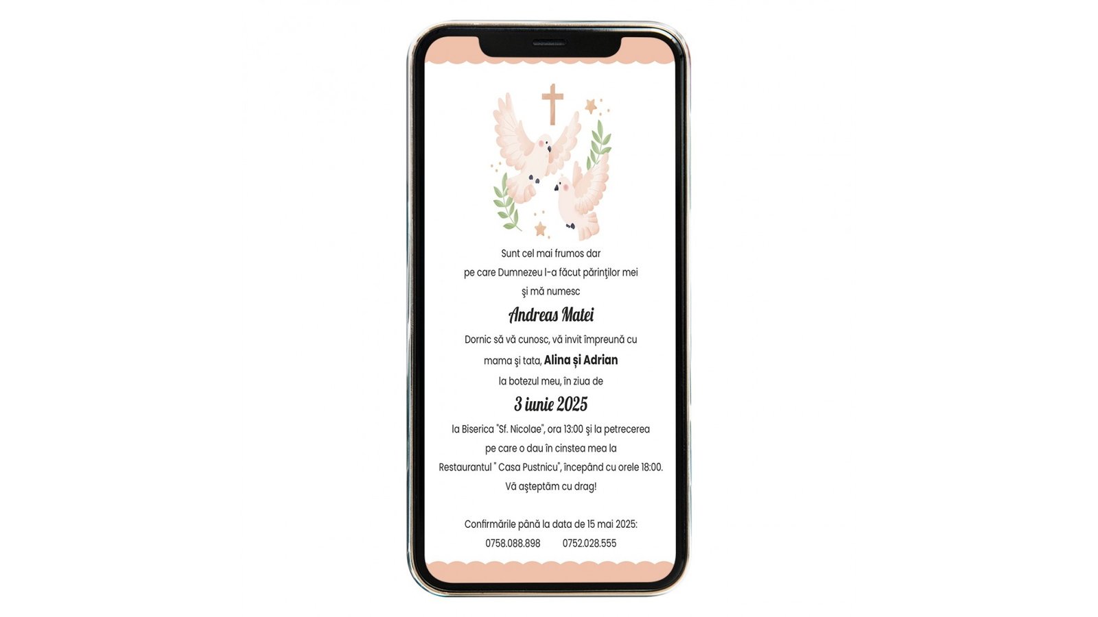 Ai un eveniment in viitorul apropiat! Vrei sa inviti oamenii rapid? [page_title], o varianta rapida si eficienta. Formatul invitatiei este JPEG, PNG sau PDF. Cum comand? Pentru a putea comanda trebuie sa urmati cativa pasi simpli: Completeaza formularul cu detaliile evenimentului, disponibil in pagina de produs. Plaseaza comanda In cat timp este gata comanda? Timpul mediu de realizare este cuprins intre 1-2 zile lucratoare. Ce se intampla dupa ce ati plasat comanda? Un coleg va reveni la dvs. cu un apel telefonic pentru confirmarea comenzii. Dupa confirmarea telefonica, veti primi pe whatssapp/mail macheta invitatiei pentru verificarea acesteia si utilizarea ei.
